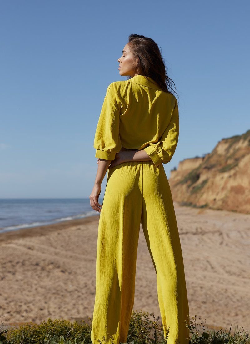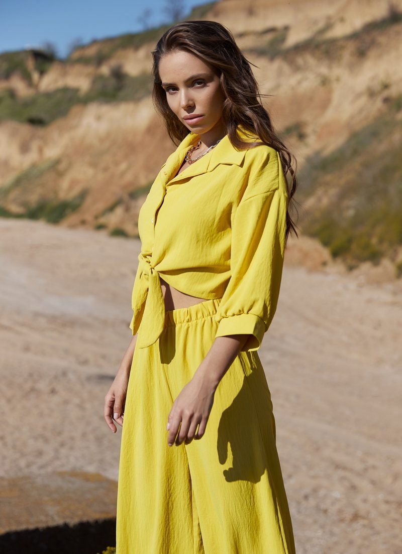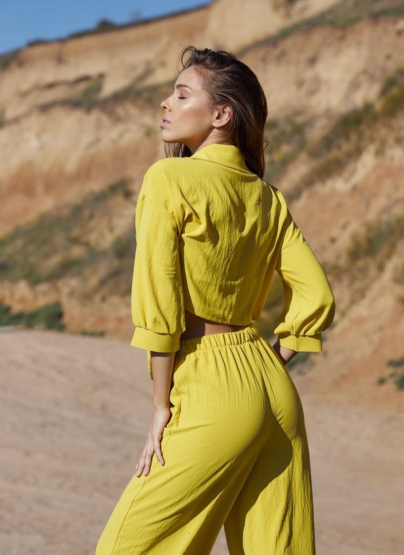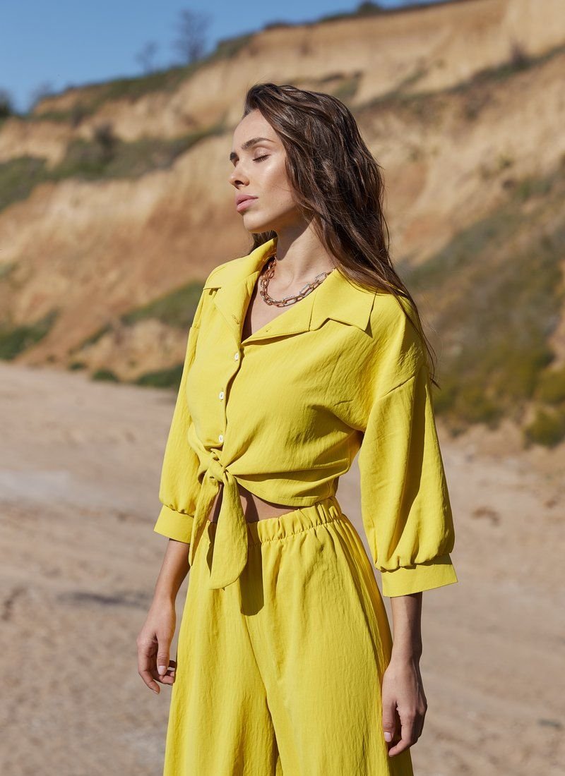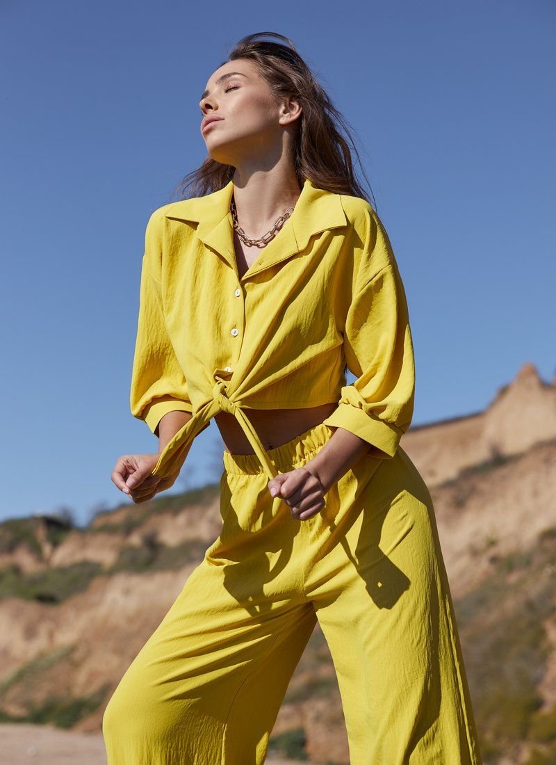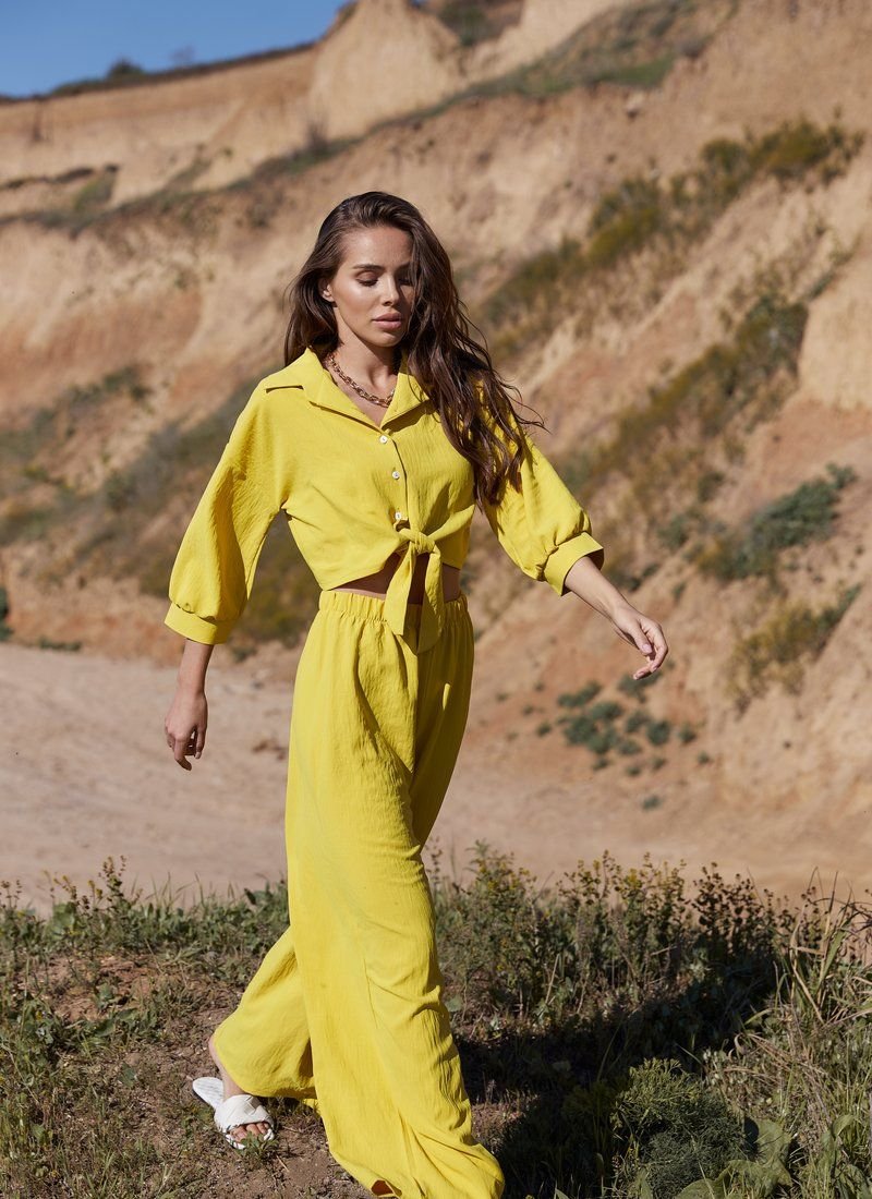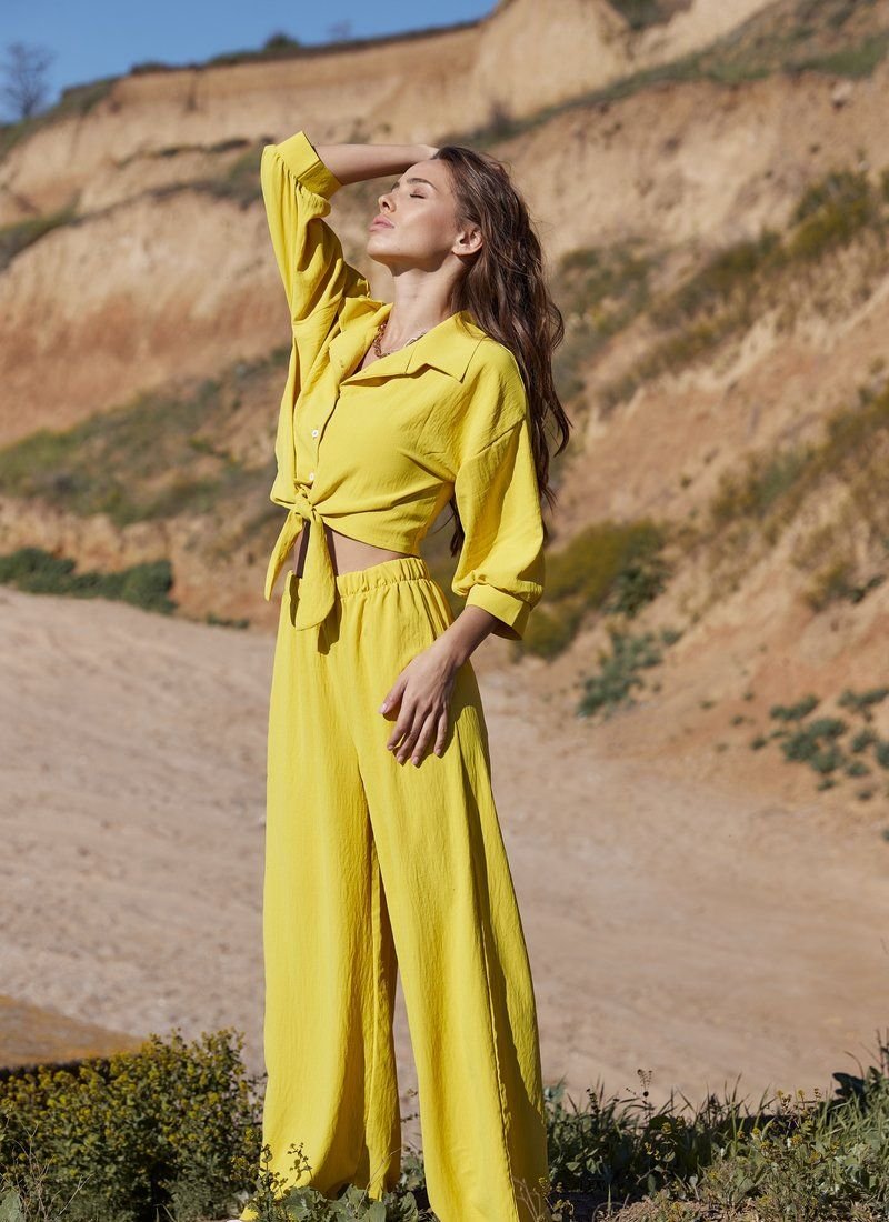 The rich mustard color sets the mood for a suit made of light fabric. The cropped shirt was supplemented with a knot, and loose trousers with an elastic waistband.