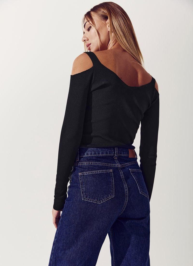 Black knitted longsleeve with open shoulders on straps. Due to its versatility, the model is suitable for both jeans and skirts. It is with the help of such basic things that you can create a lot of images.