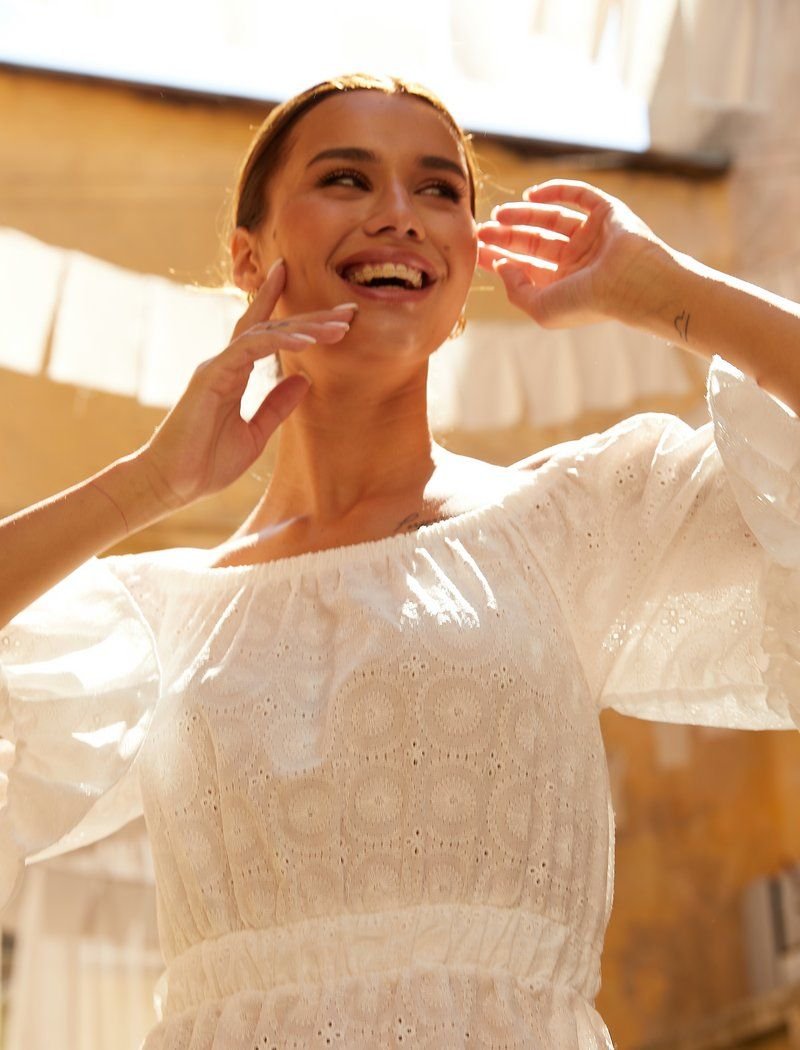 An actual summer dress made of white cotton fabric with floral embroidery. Open shoulders and a wide sleeve with a flounce give the dress a special romantic mood. The short flared skirt is decorated with a wide frill. For maximum comfort when wearing, elastic inserts are provided in this model.
