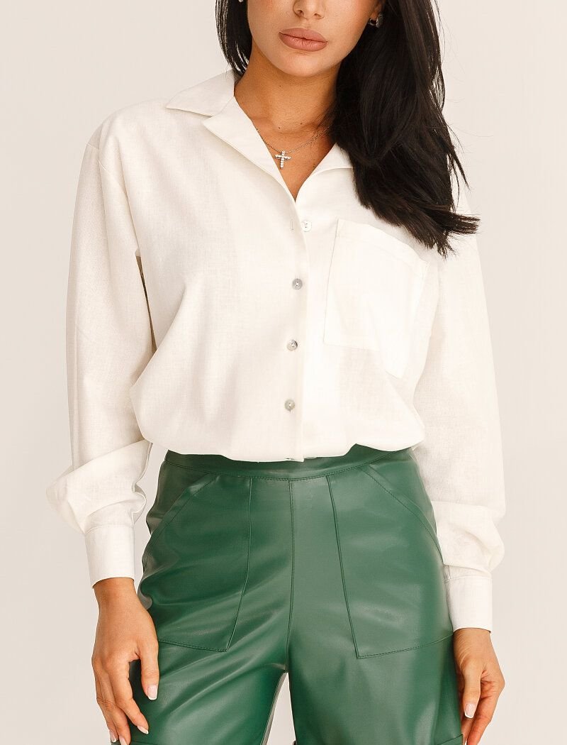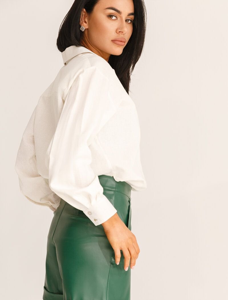 Stylish shorts made of eco-leather on a fabric basis with a high fit. Elastic insert at the waist, two patch pockets in the front and fixed lapels.