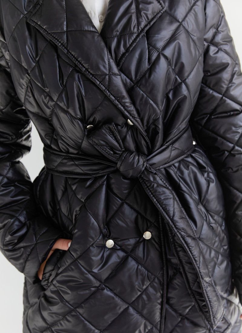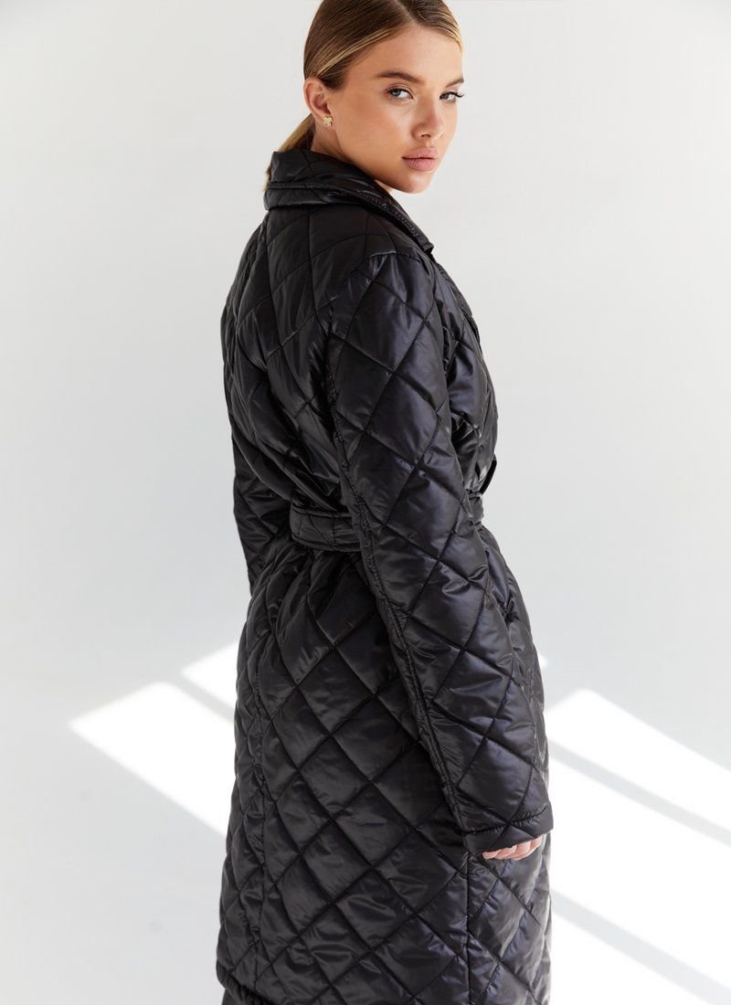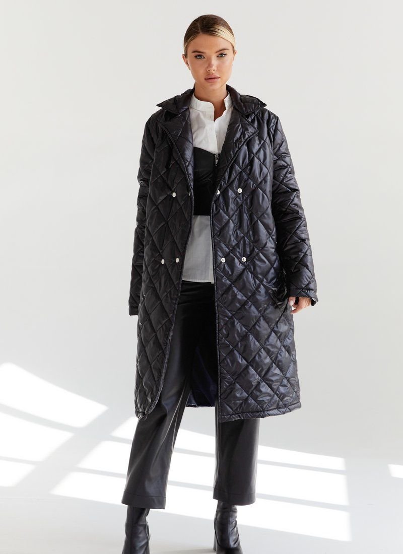 Black elongated jacket with buttons, straight cut, with lapels, complete with a matching belt. Quilted models have become a hit of the FW 2021/22 season. In their collections, this trend was supported by such fashion houses as Max Mara, Barbara Bui and Raf Simons. Features: the role of insulation is sintepon (80 g/m2). Please note that the product is designed for temperatures up to +10 ° C.