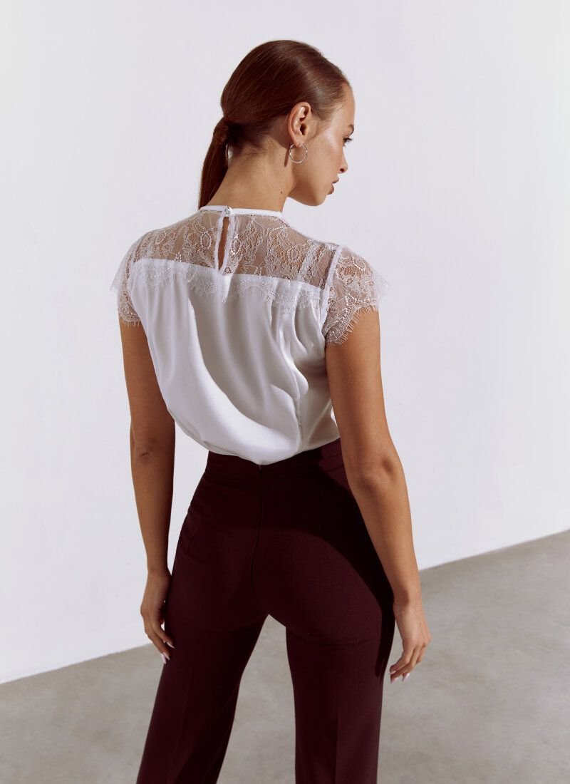 Silk blouse in white: round neck, back drop neckline with button, yoke and sleeves are made of refined French lace with floral motifs.