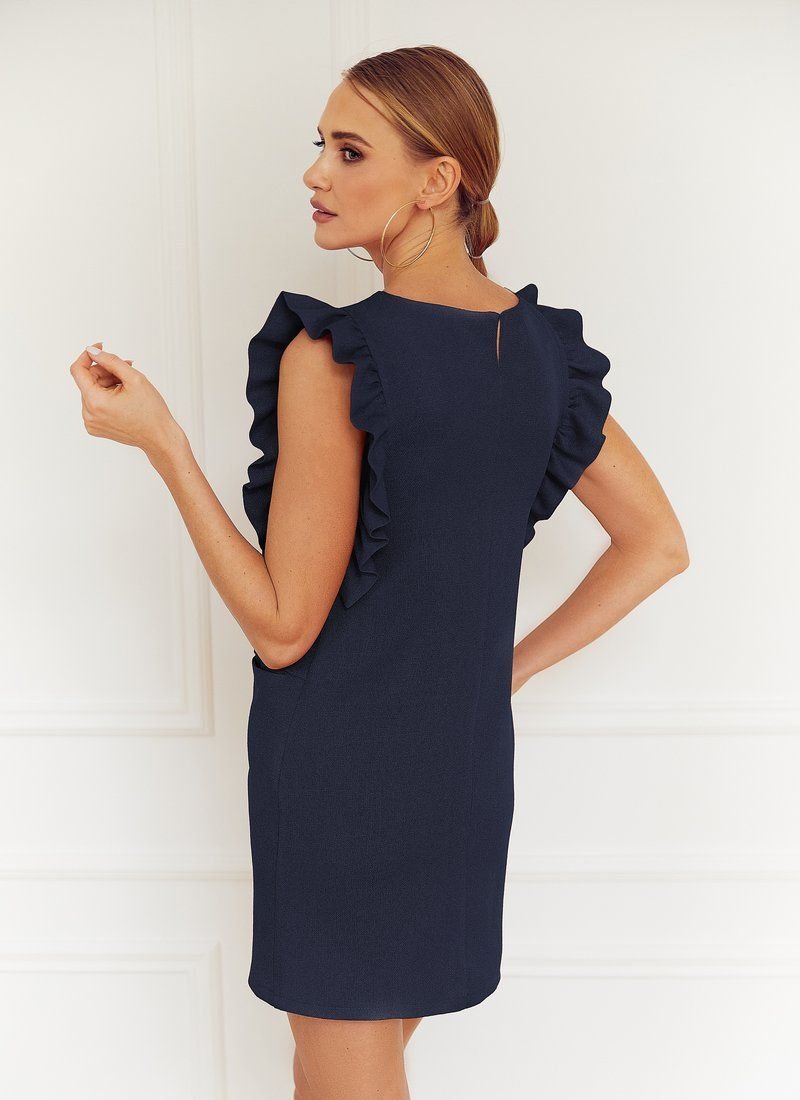 The straight-cut blue dress turned out to be girlish romantic. To sew a model with ruffled sleeves and sew-in pockets on the waistline, artificial linen was used, which is characterized by a non-uniform texture.