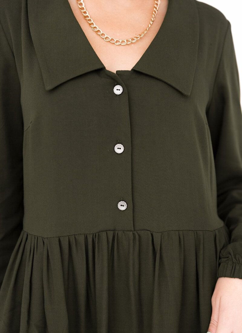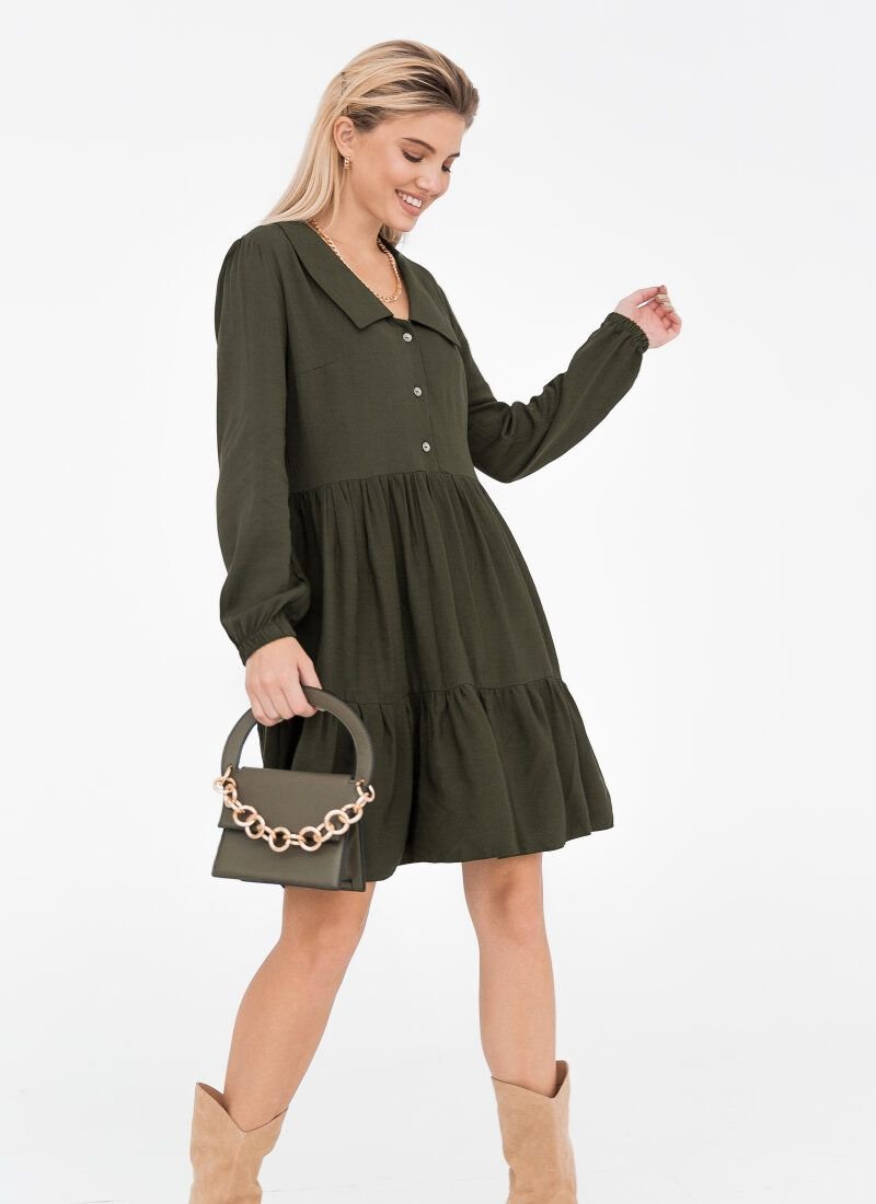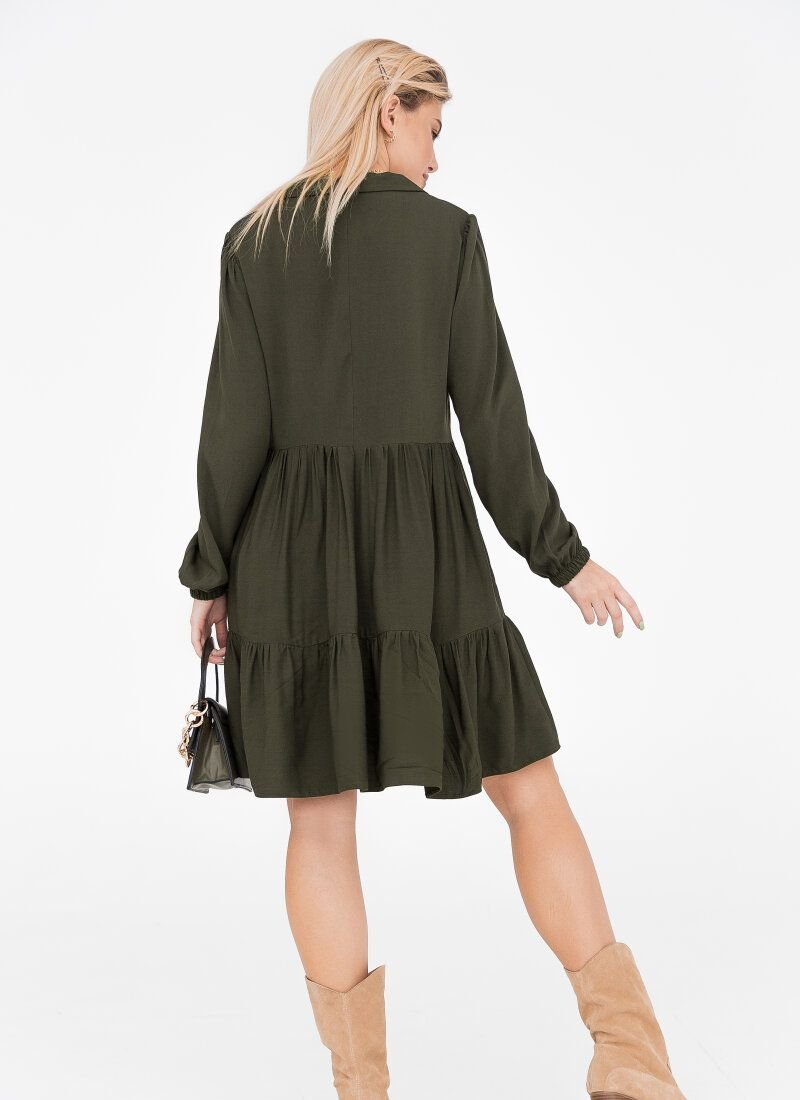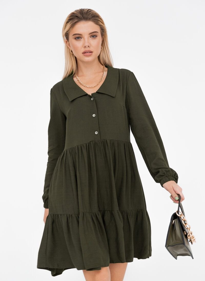 The khaki color does not prevent the dress from being as feminine as possible. A soft flying material was chosen for the manufacture, which lies in waves in a two-tiered skirt. The model is complemented by a turn-down collar and long sleeves with an elastic cuff.