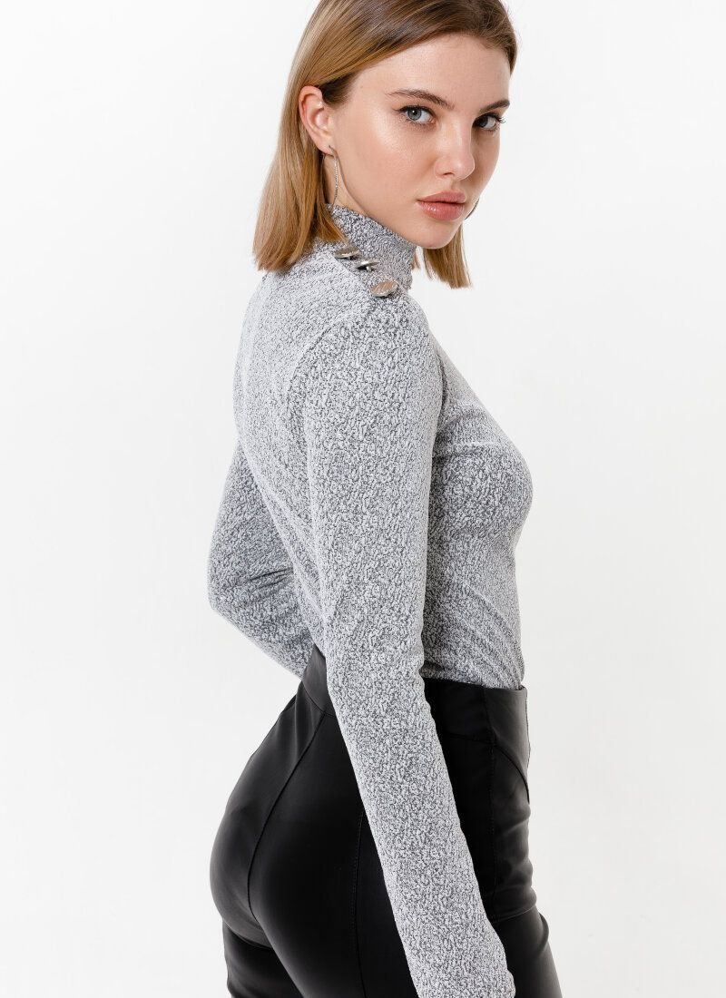 Turtleneck made of white knitted material with a shimmering effect: a stand-up collar with buttons and zippers at the back, shoulders with modeling foam inserts and decorative buttons.
