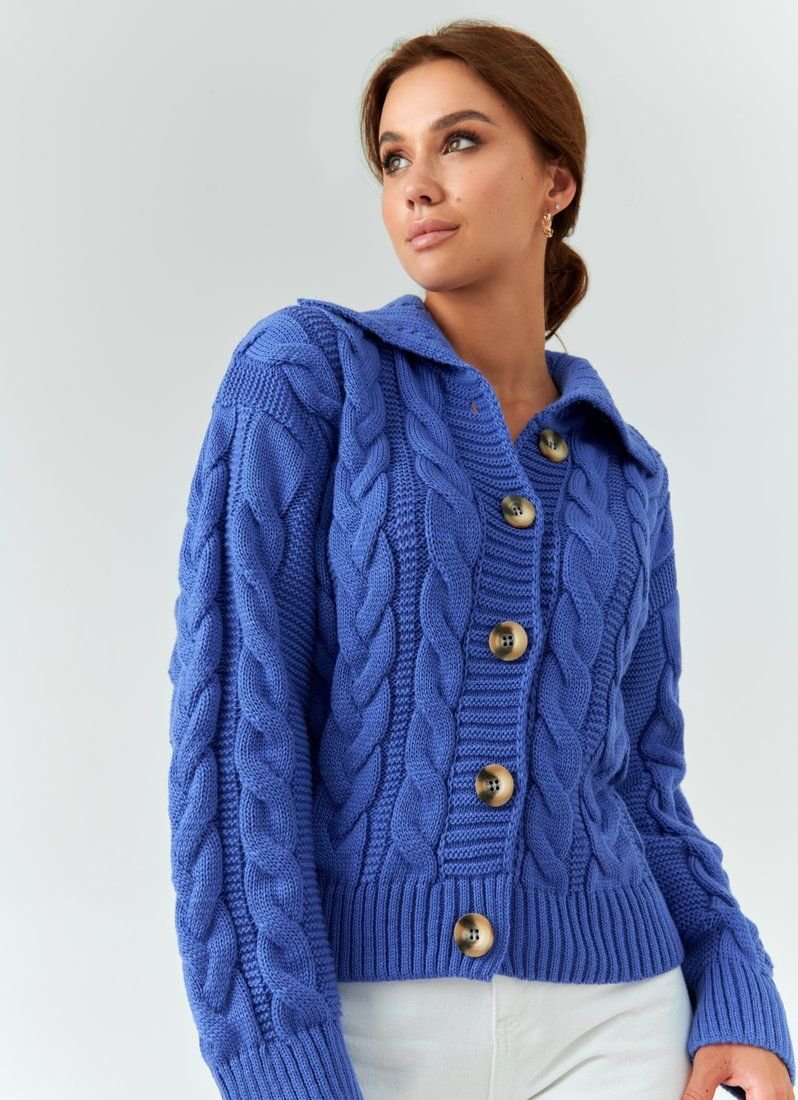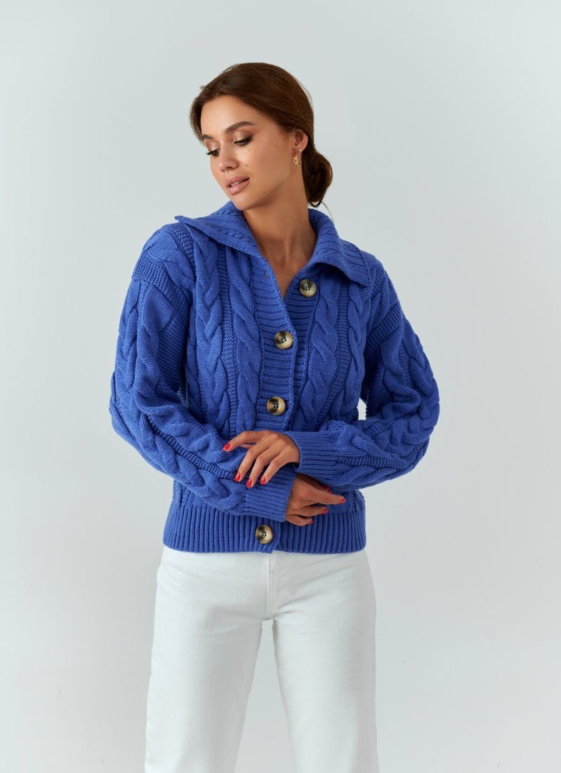 Blue wool jumper with buttons. The jumper is decorated with a knitted pigtail, as well as a large collar. This model can be worn as an independent thing, or over tops or shirts.