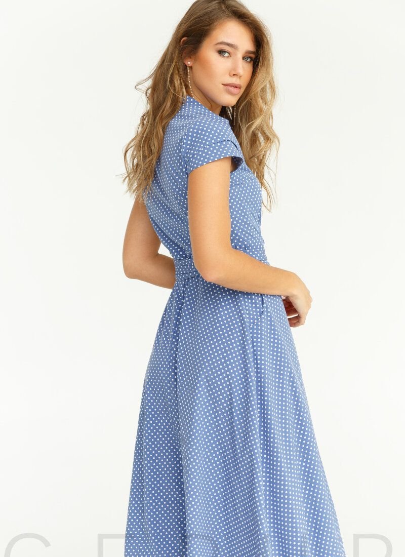 A laconic summer dress with a v-neck, a strict stand-up collar and a flowing midi skirt.