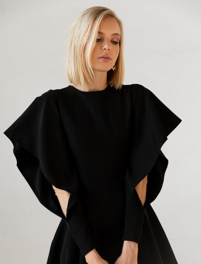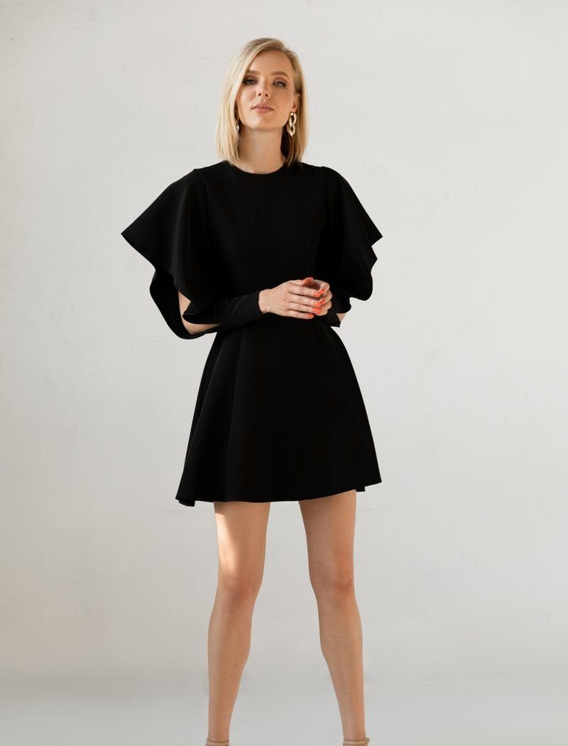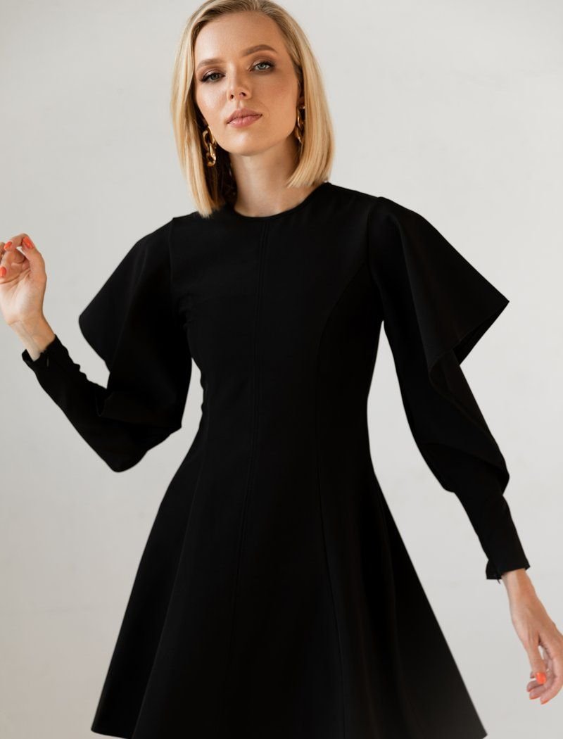 Black mini dress with a round neck. There is a small zipper on the back, long open sleeves with flounces from the shoulder and zippers on the cuffs, which will become an accent in your image.