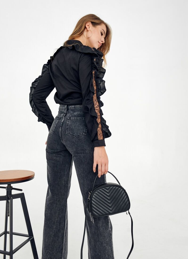 Despite the restrained black color, the blouse will solo in the image. The whole accent of the model consists in long sleeves with openwork inserts framed by flounces.