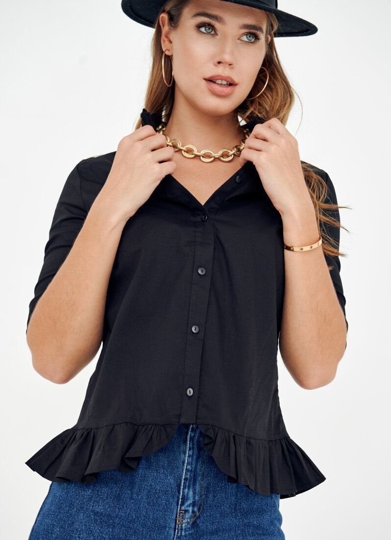 A black shirt will dilute the classic office dress code and allow you to get rid of excessive rigor in the image. A dense cotton-based material was chosen for sewing the model. The lower edge of the product was supplemented with a frill.
