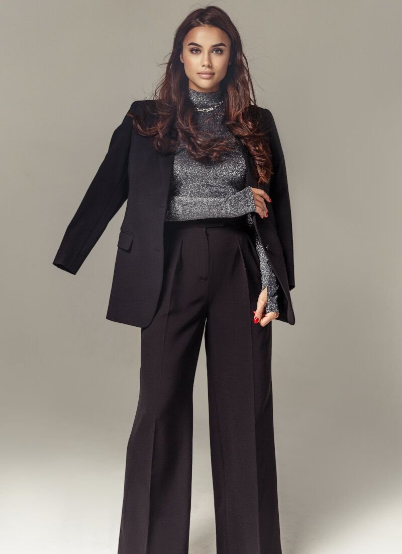 A black body made of shimmering lurex will help to create a moderately provocative image. The form-fitting lightweight model is complemented by a stand-up collar and long sleeves.