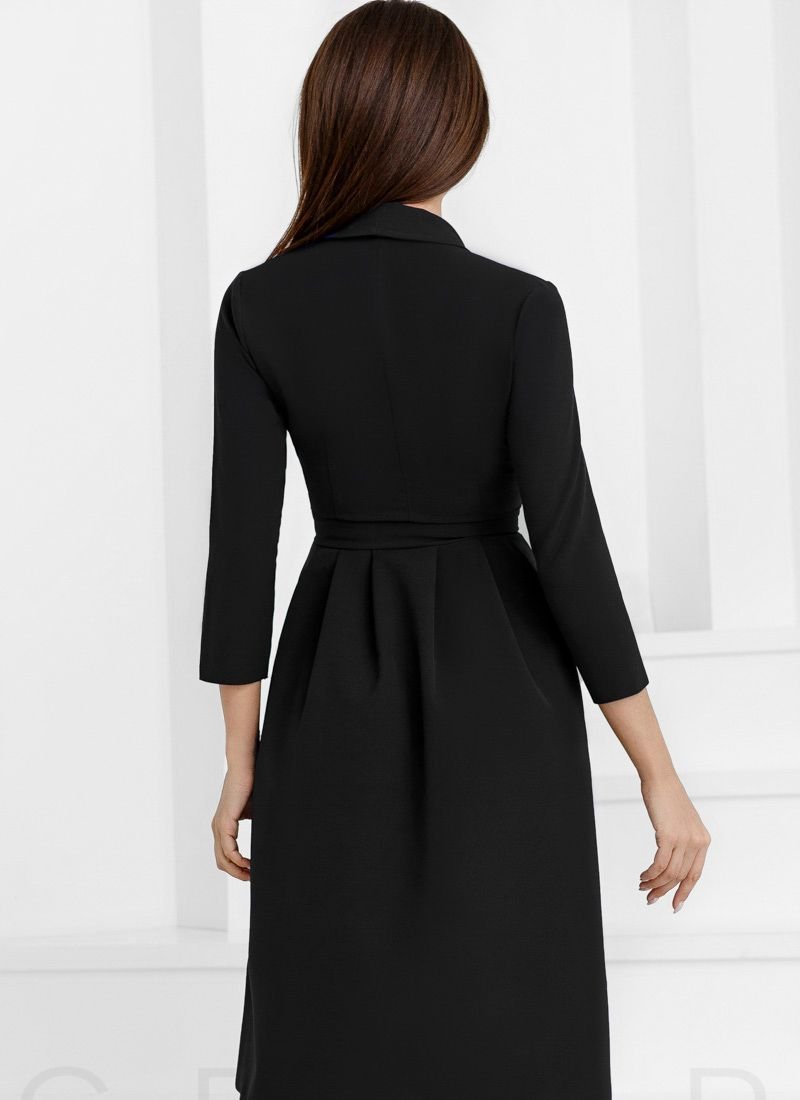 A dress for the smell in a business style: a tight 3/4 sleeve, a spectacular v-neck on the chest and a skirt with soft pleats and pockets in the seams.
