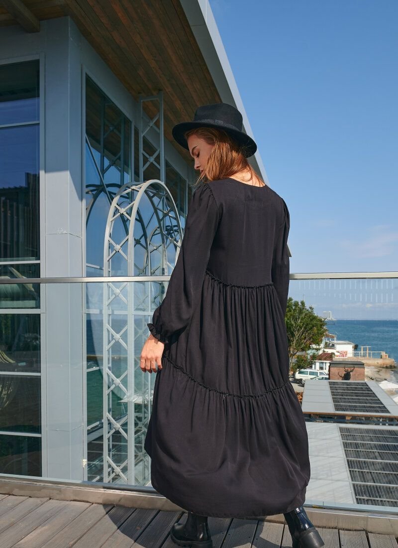 Despite the loose cut, the black dress is not devoid of femininity. A multi-tiered skirt and voluminous sleeves with an elastic cuff work for this. The model is complemented by a round neckline that balances the style.