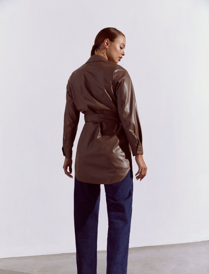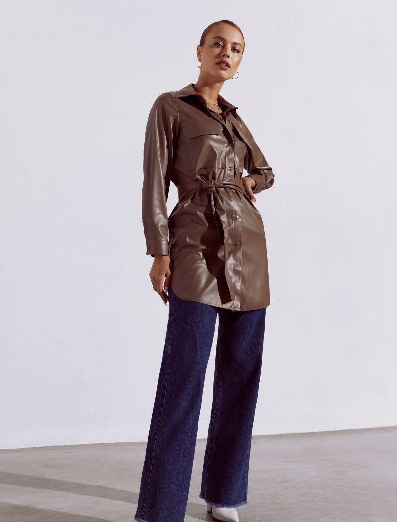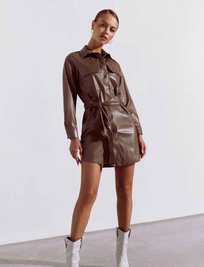 Shirt-cut dresses do not leave the fashion catwalks: they could be found at the shows of Celine and Chloe FW20/21. The mocha-colored model is complemented by a button closure, chest patch pockets and a turn-down collar. A wide belt made of textured eco-leather in the set emphasizes the waist.