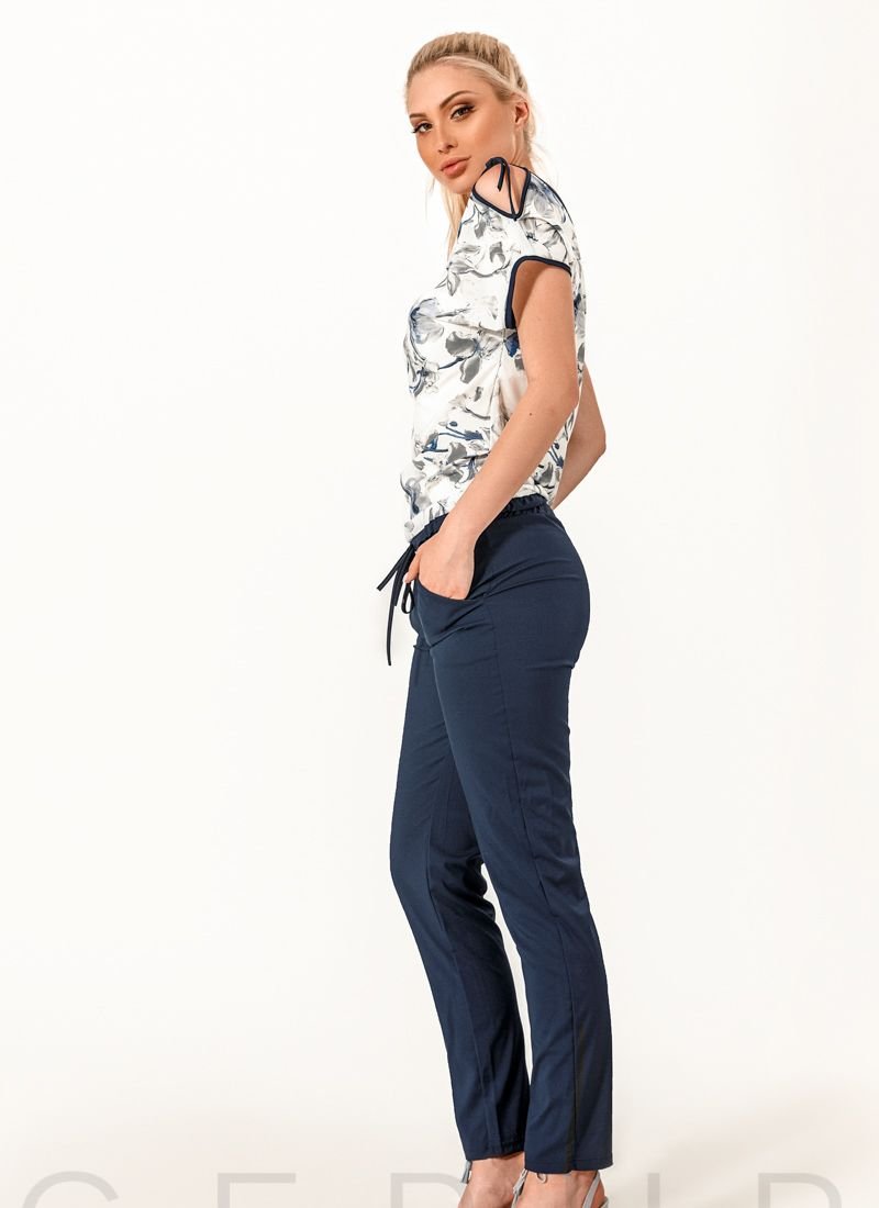 Casual suit: loose-fitting blouse in floral print, boat neck with thin straps, short sleeves with open shoulders and ties at the bottom, spacious straight trousers of medium fit on an elastic waist and two welt pockets. ..