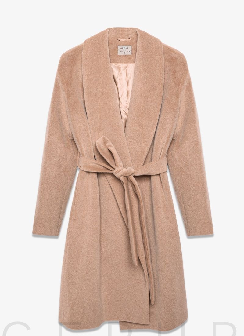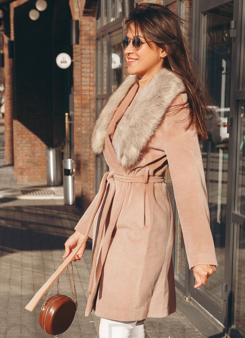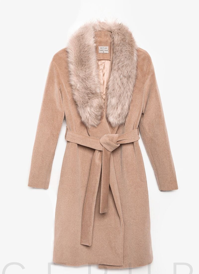 Classic cut coat from Gepur designers, made of premium-class coat fabric: turn-down collar with removable collar made of luxurious eco-fur, long sleeve, plain removable belt in loops, slit in the back and branded lining made of artificial satin.
