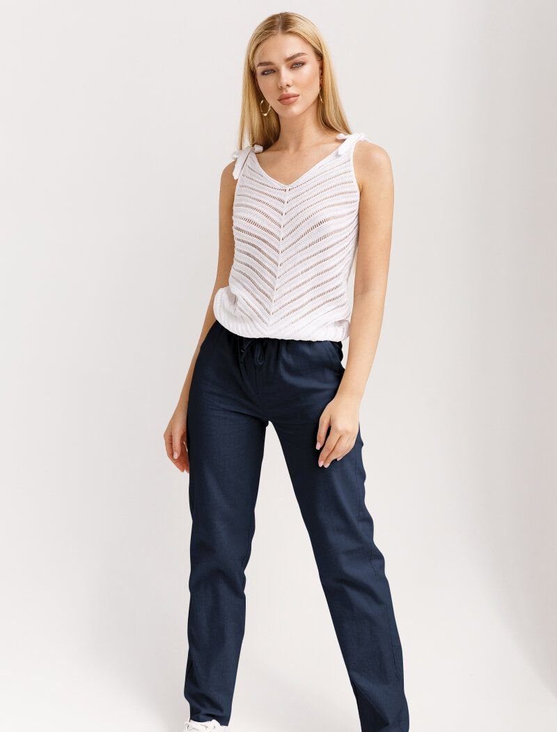 Loose-fitting trousers made of breathable blue linen fabric. Elastic waistband with ties for a comfortable fixation at the waist, two welt pockets on the hips.