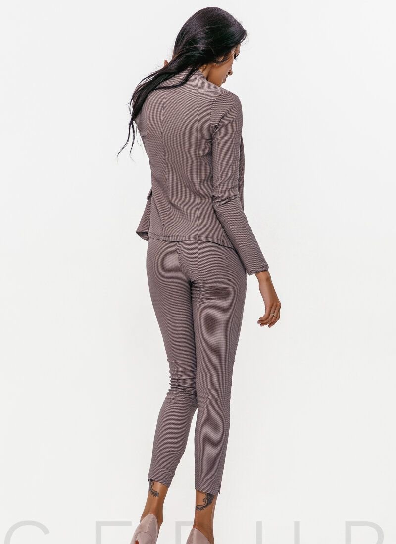 Stylish pantsuit: fitted jacket with a stand-up collar, long sleeves and flaps, trousers of medium fit with a narrow cut.