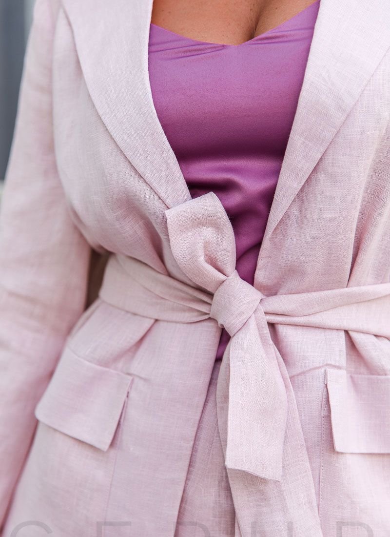 Trendy pantsuit from Gepur designers, sewn from premium-class fabric: jacket in the oversize style, with a plain belt, welt pockets with a flap, a classic turn-down collar and lapels, loose-fitting trousers with a high fit. ..
