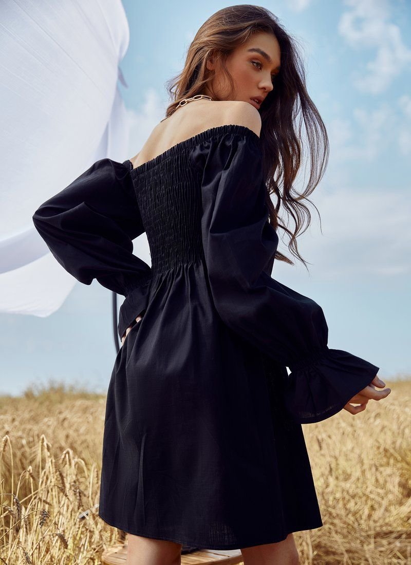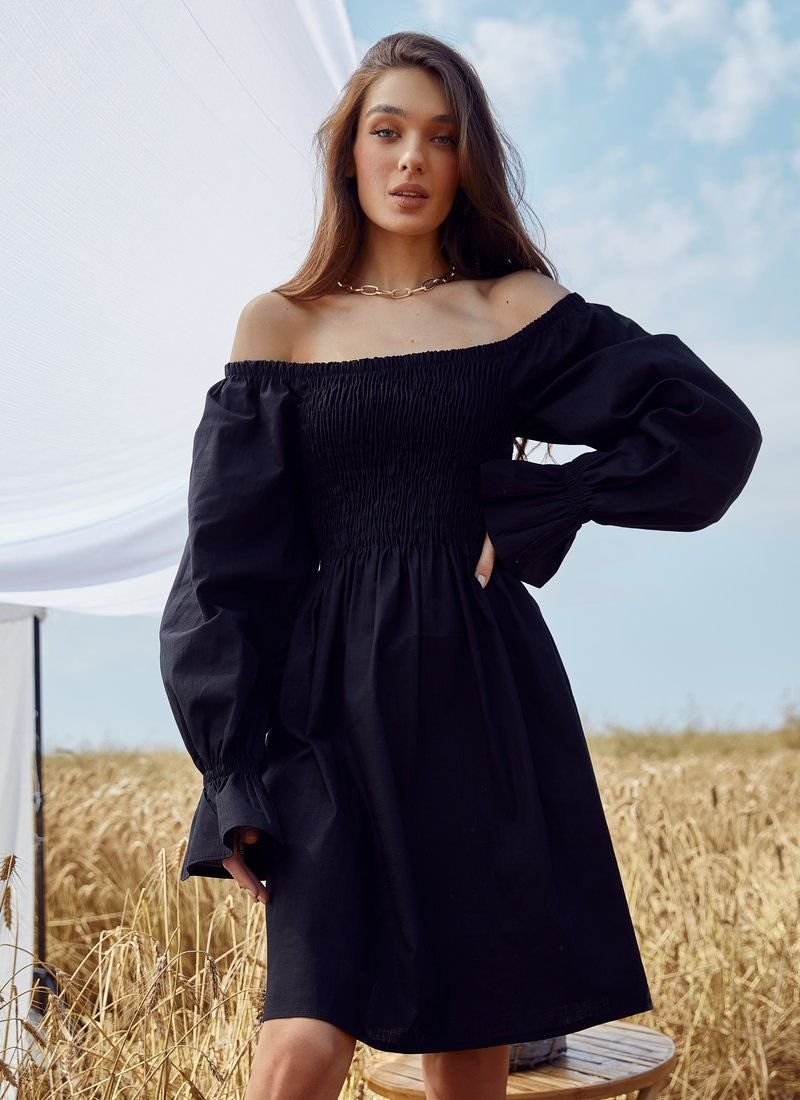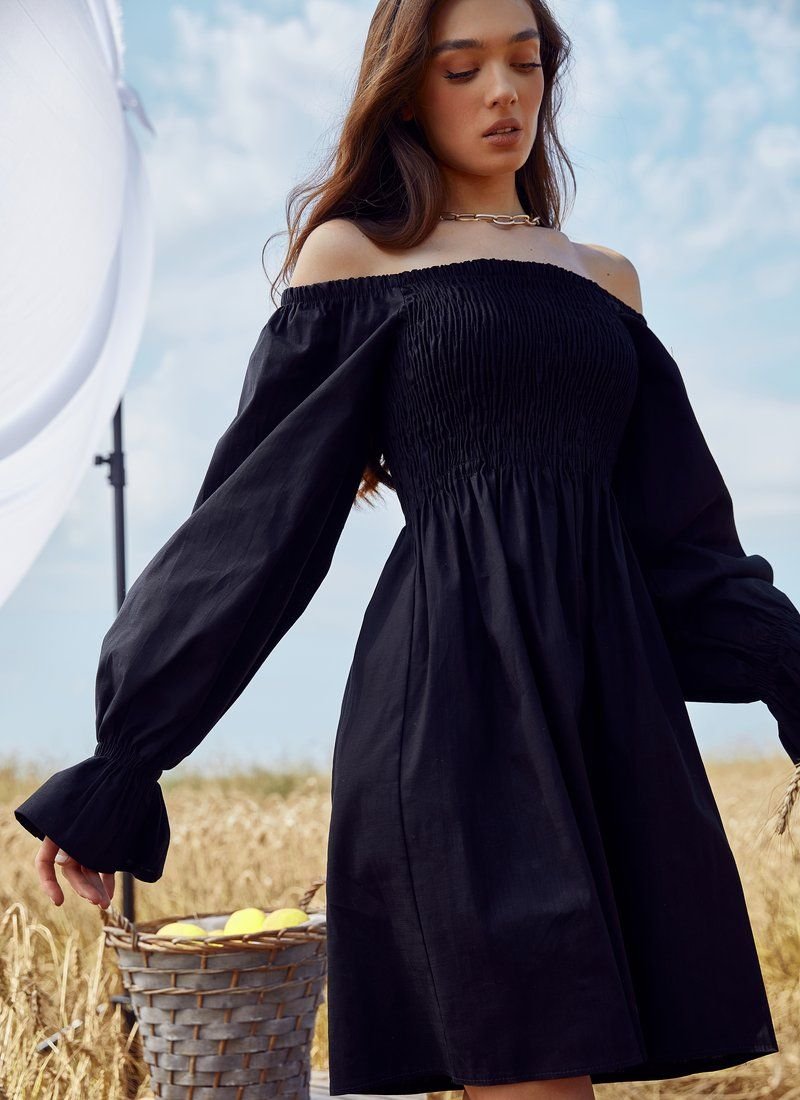 A romantic off-the-shoulder dress looks spectacular. The basic black color, elastic bodice and long voluminous sleeves work for this. The mood is also supported by the material: the model was sewn from linen.