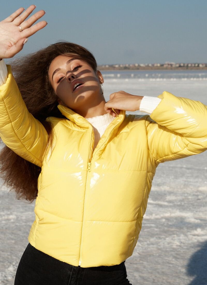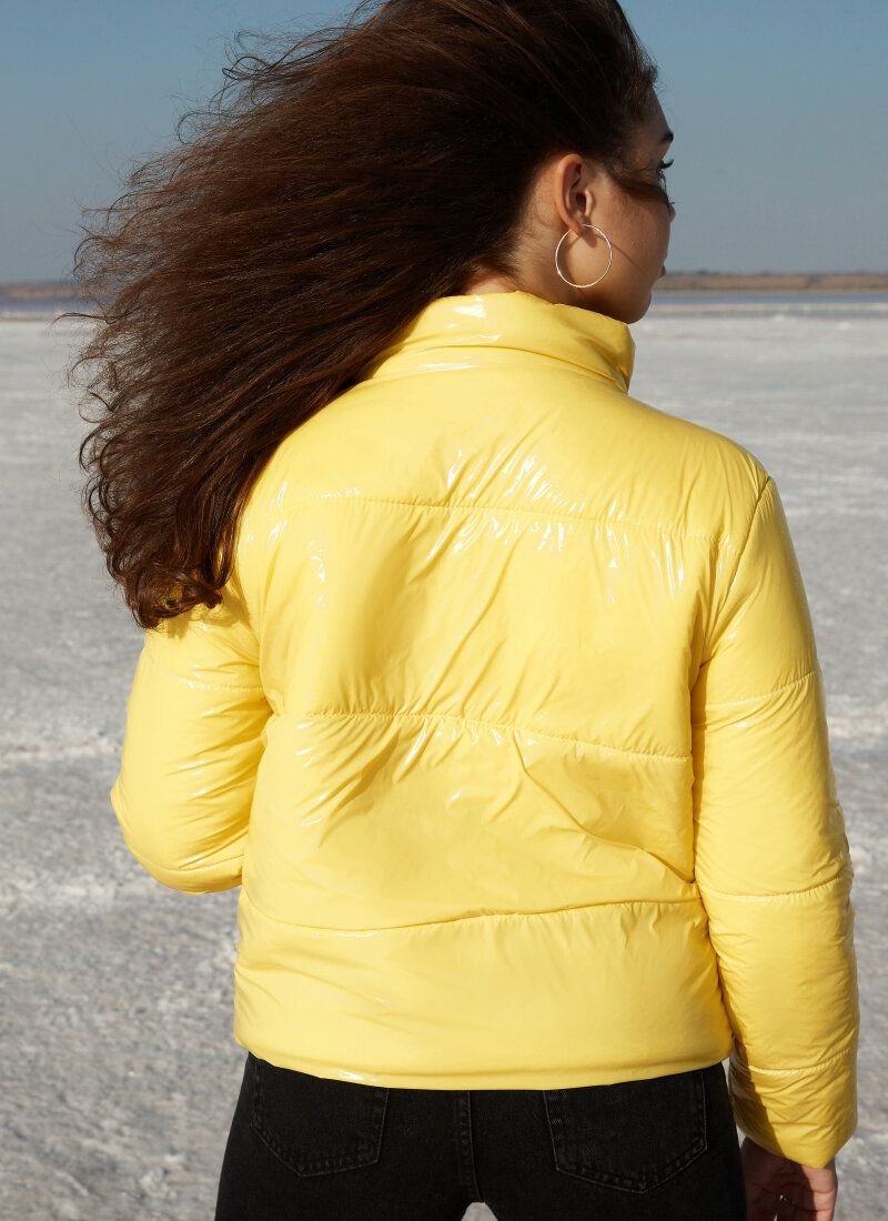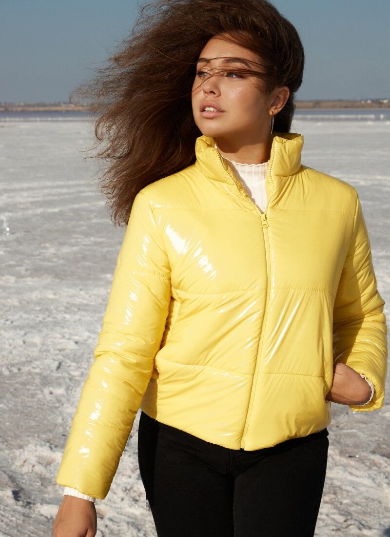 A quilted jacket of bright yellow color easily protects against the vagaries of the off-season weather. The shortened model made of glossy raincoat material is so light that it is practically not felt on the body, but at the same time it keeps the temperature well due to the insulation. The jacket is complemented by a stand-up collar and welt pockets.Features: silicone acts as a heater (200 g/m2). Please note that the product is designed for temperatures up to -10 °C.