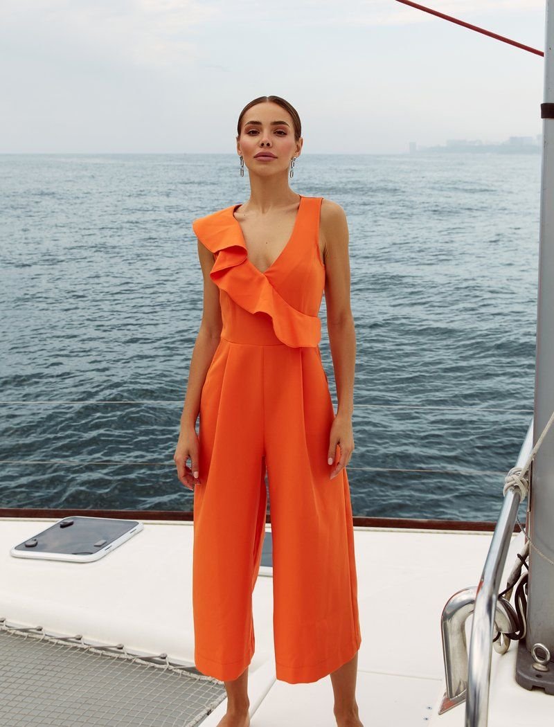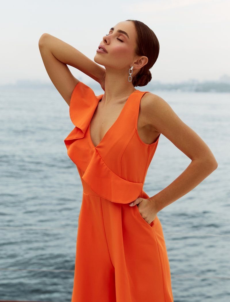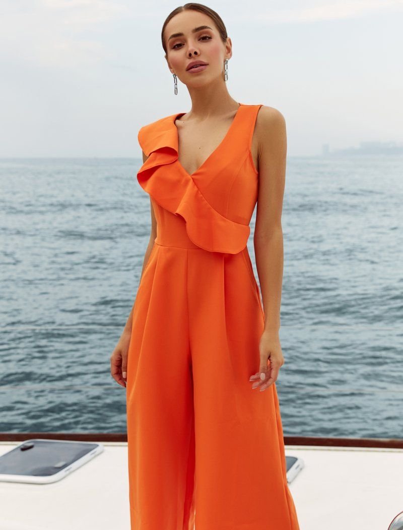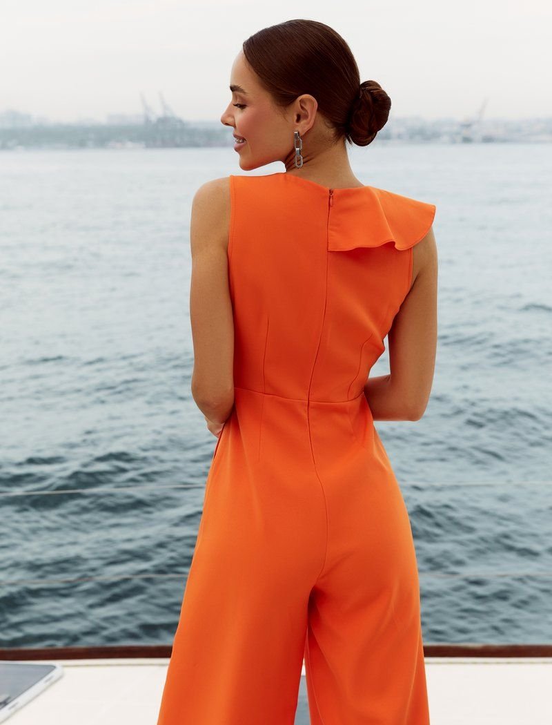 A bright jumpsuit with flared trousers made of soft suit fabric. A deep neckline on the chest, a wide armhole, small pinches on the belt and two small pockets on the sides. The main decoration of the model was the decor with a shuttlecock, which descends diagonally from the shoulder to the waist.