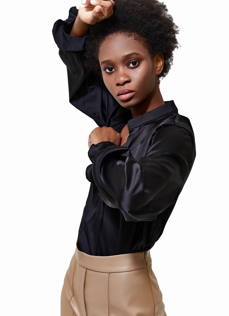 Black silk blouse with long sleeves, turn-down collar. This model will add a classic look to your image. The blouse looks great with both trousers and jeans.