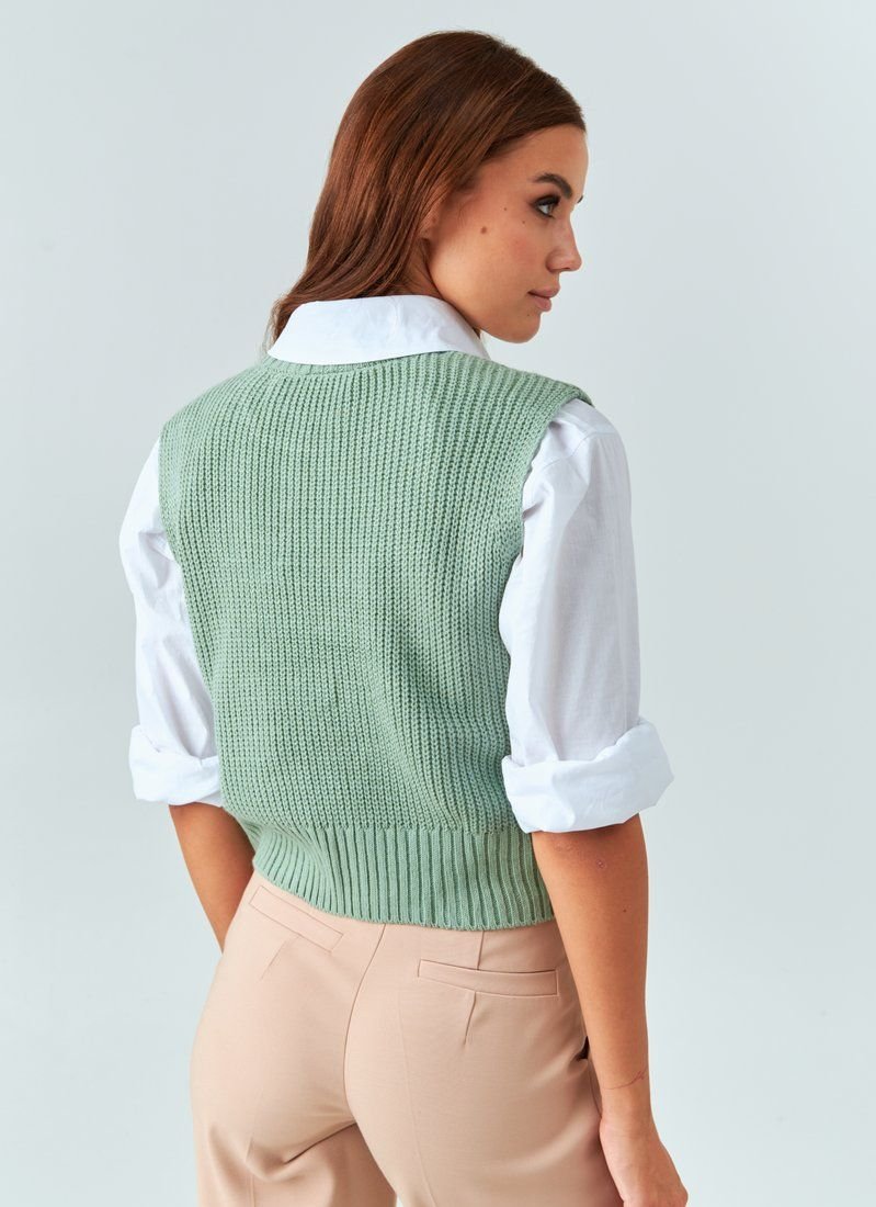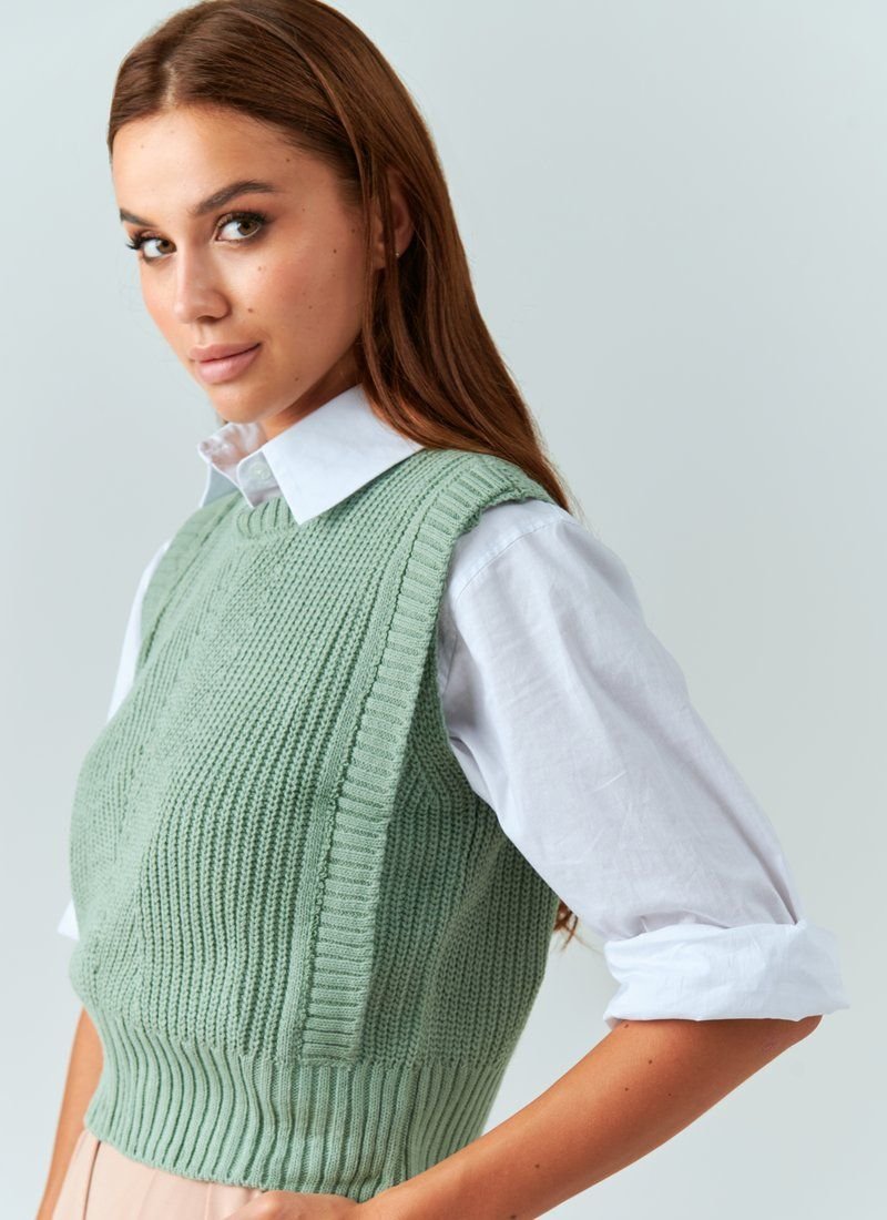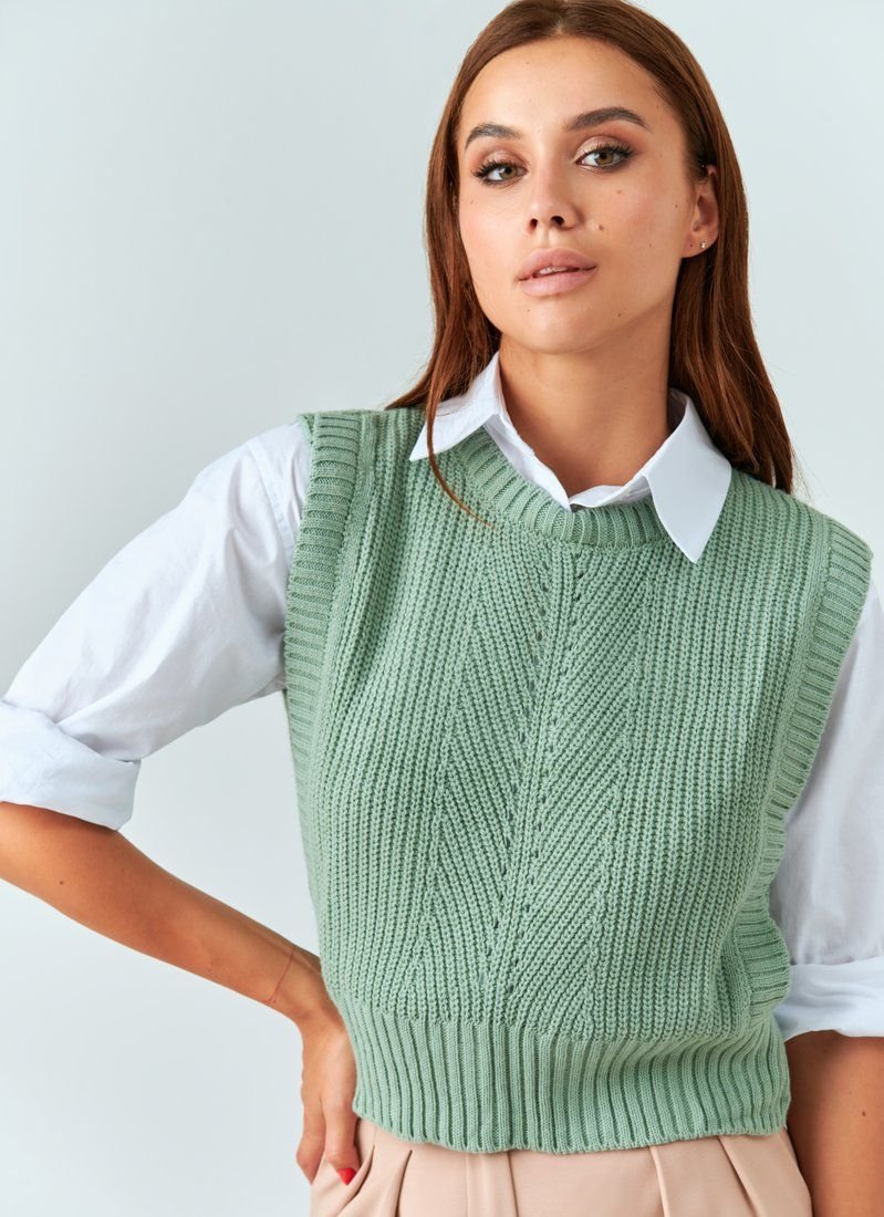 Knitted vest of delicate pistachio shade. Such a thing in the wardrobe will help dilute the everyday image and make it more interesting. In particular, it will look stylish in combination with shirts.