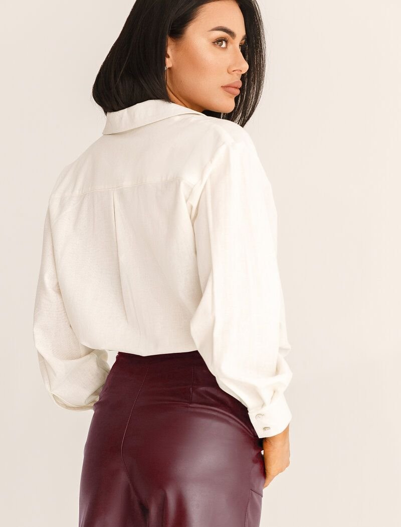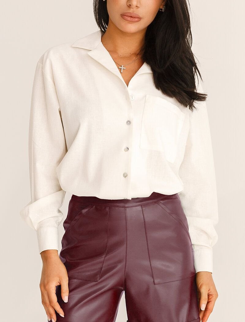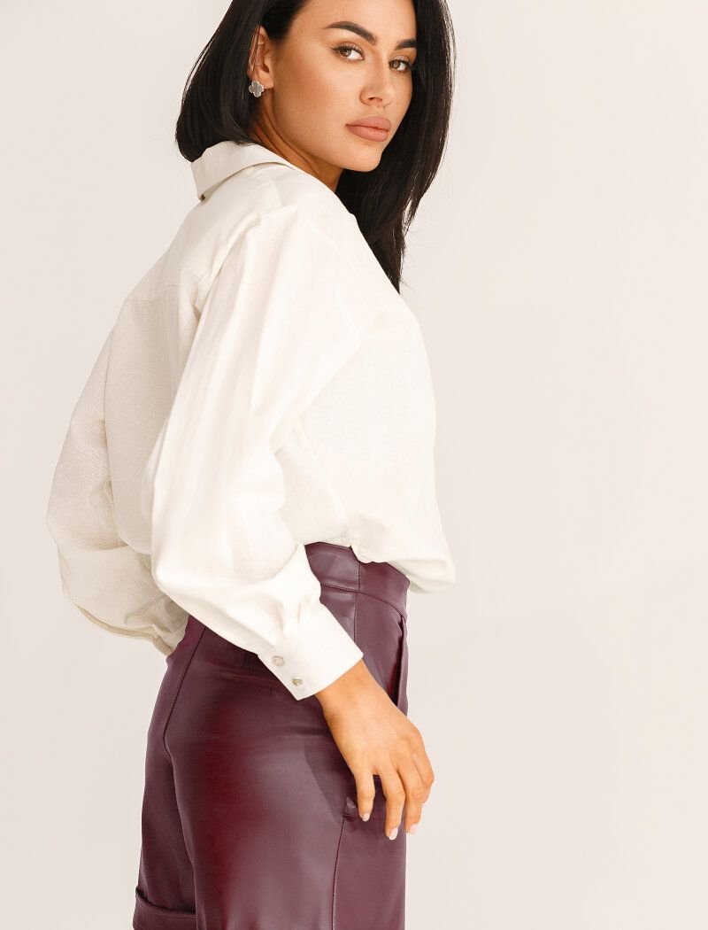 Stylish shorts made of eco-leather on a fabric basis with a high waist. Elastic insert at the waist, two patch pockets in the front and fixed lapels.