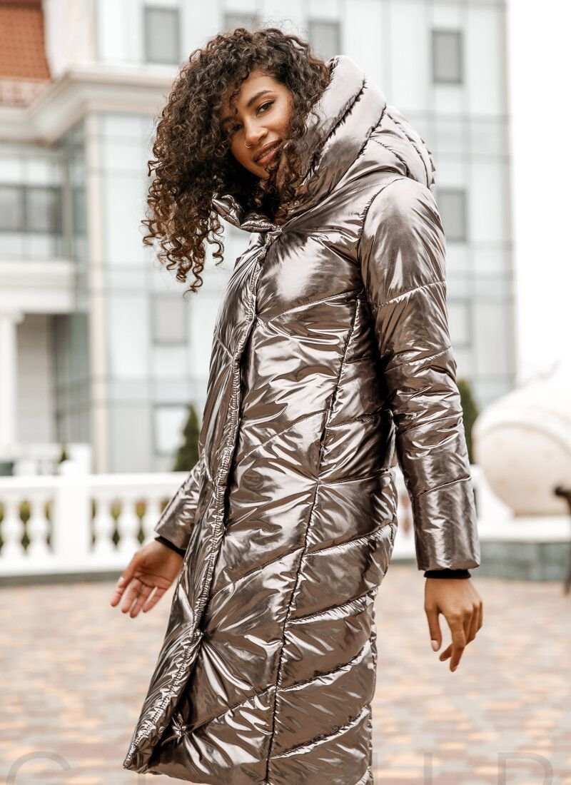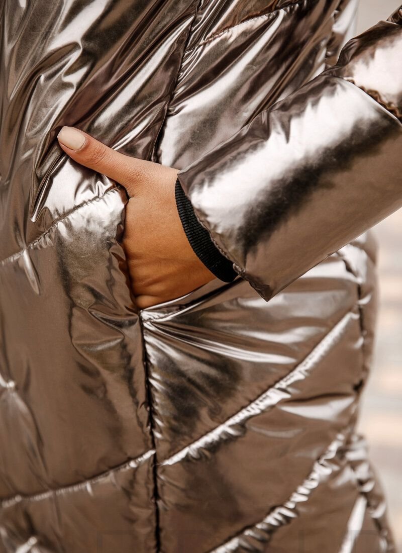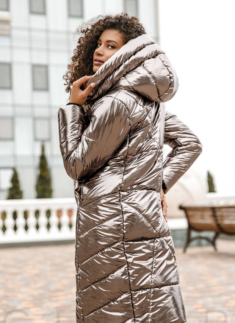 An elongated jacket-coat of a bronze shade on an eco-friendly insulation: a cozy hood with a stand-up collar with hidden buttons, a long sleeve on a knitted cuff, two pockets in the seams and a hidden strap with buttons in front.Features: insulation - holofiber (250 g/m2). Please note that the product is designed for temperatures from -10°C to -20°C.
