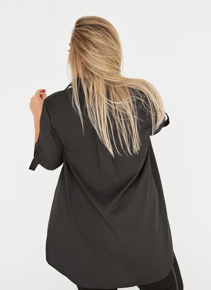 Black shirt with a loose fit. Original design with an elongated back and a turn-down collar. In the front part, the model is complemented by a shuttlecock on the bottom edge. Adjustable sleeves. The shirt will add a romantic accent to your business look.