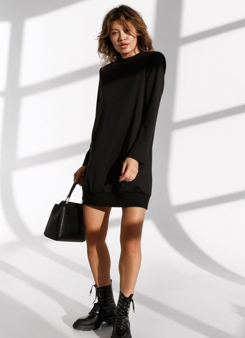 Working on a loose dress, Gepur designers relied on the contrast of colors. The basic black color of the product was contrasted with white, in which a removable turn-down collar is made. If desired, the contrasting detail can be removed, leaving the model as concise as possible. The shoulder line was emphasized with foam inserts.