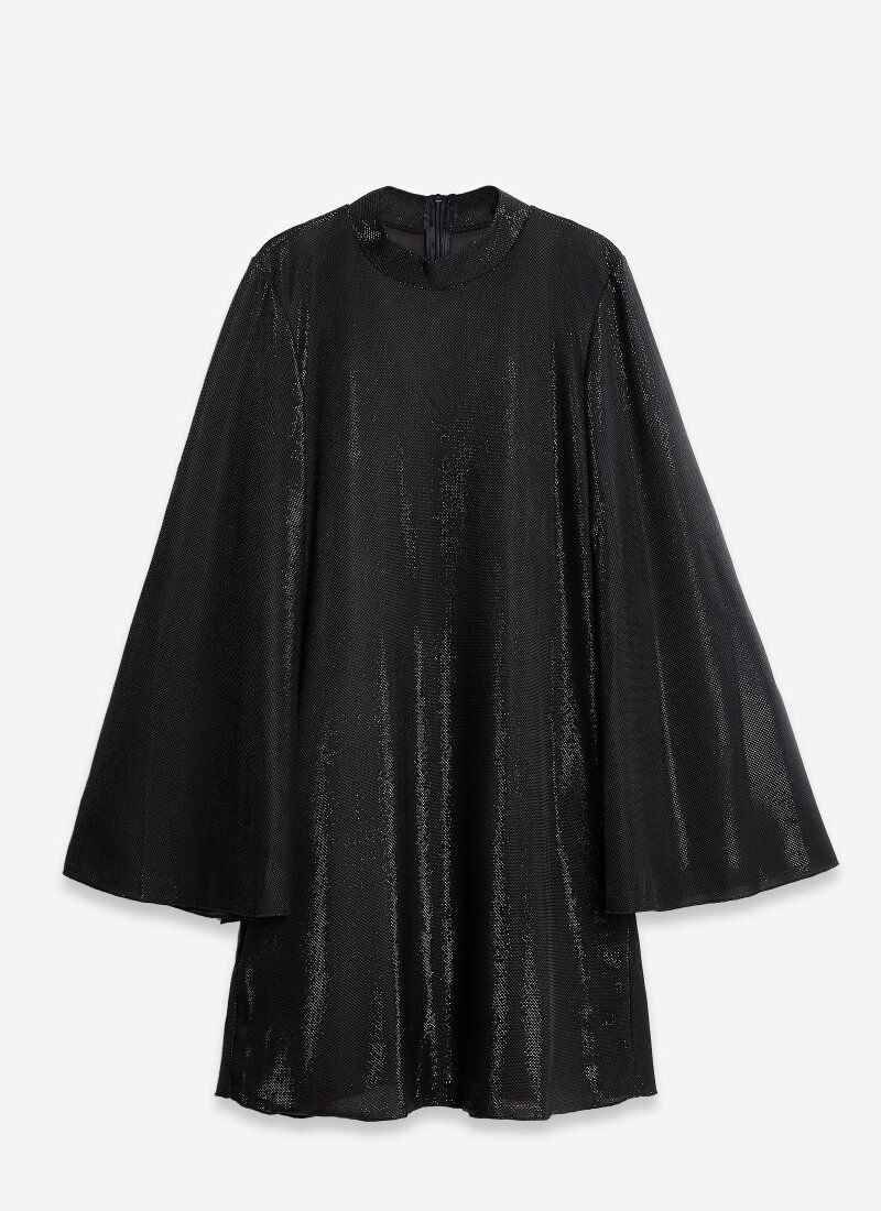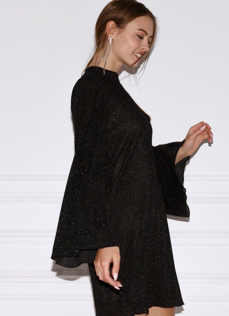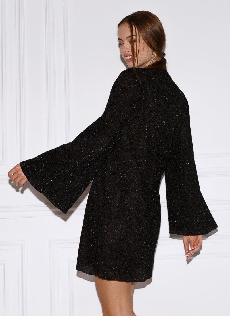 A romantic mini dress allows you to shine at any event. The light shimmering material is balanced by a loose fit with a stand-up collar and wide sleeves. The model is complemented by a lining that fits nicely to the body.