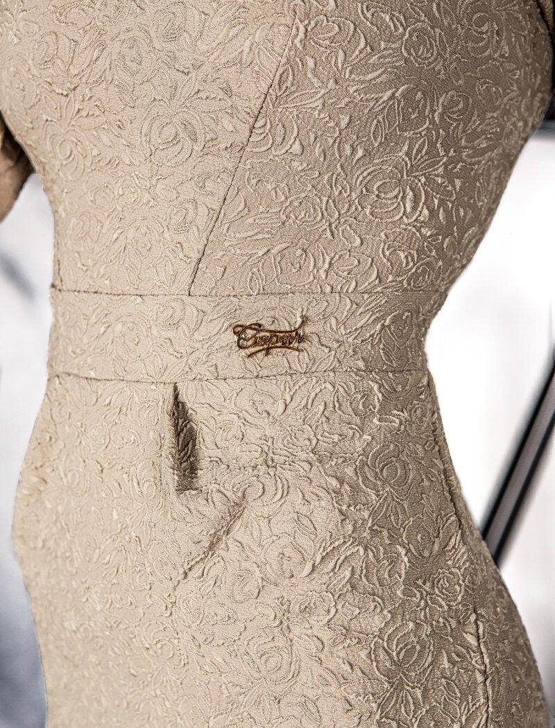 Knitted sheath dress from Gepur designers: a neat round neck, a long sleeve with an accent on the shoulders, a sew-in belt and a tight skirt with small pinches.