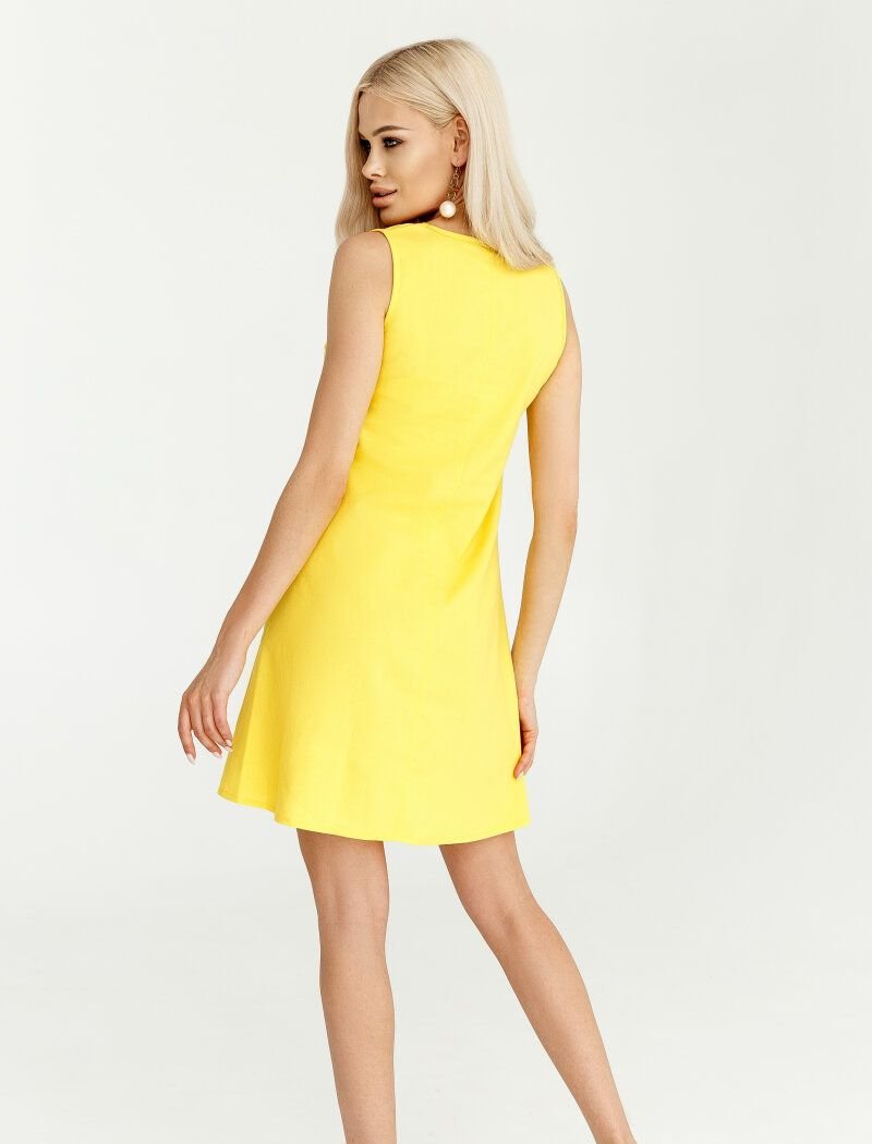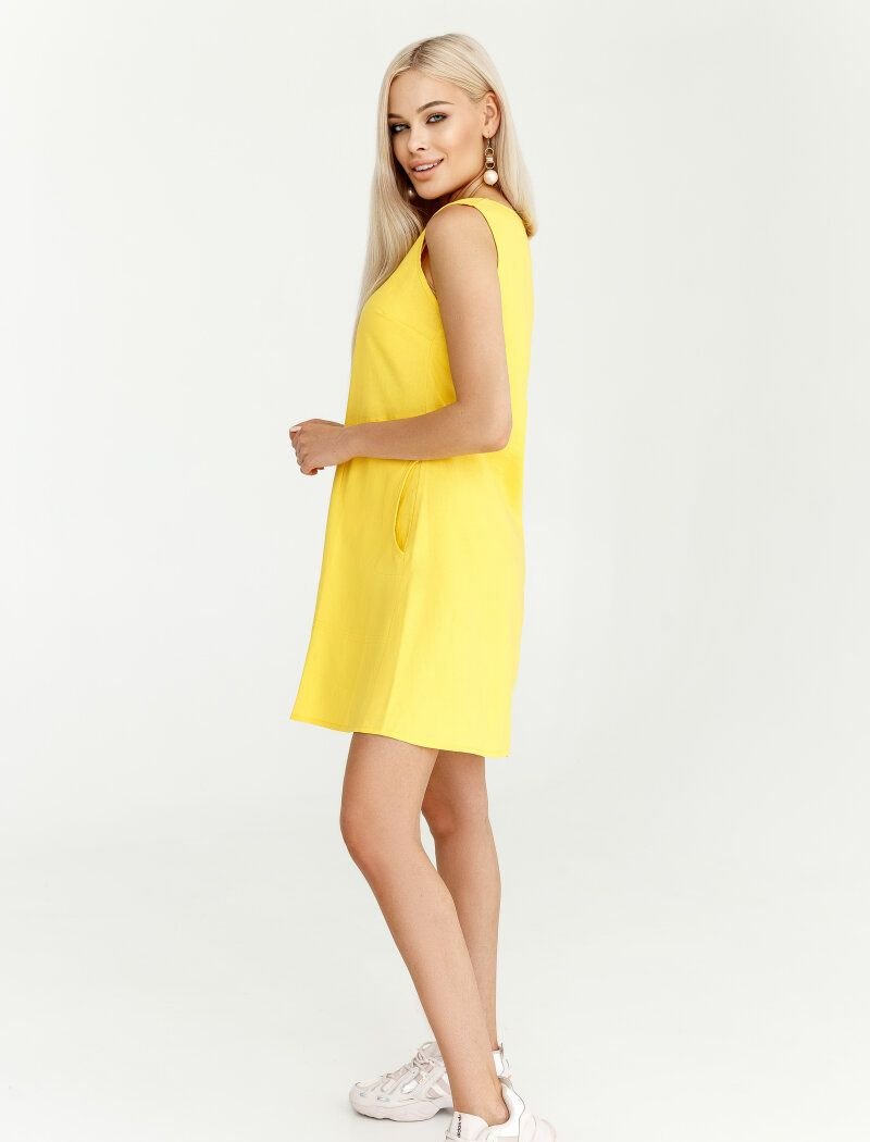 A restrained dress of a classic a-silhouette in yellow. Two patch round pockets on the sides.