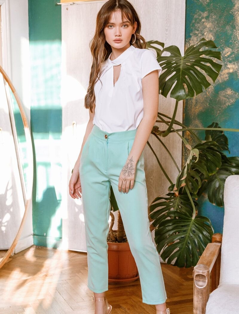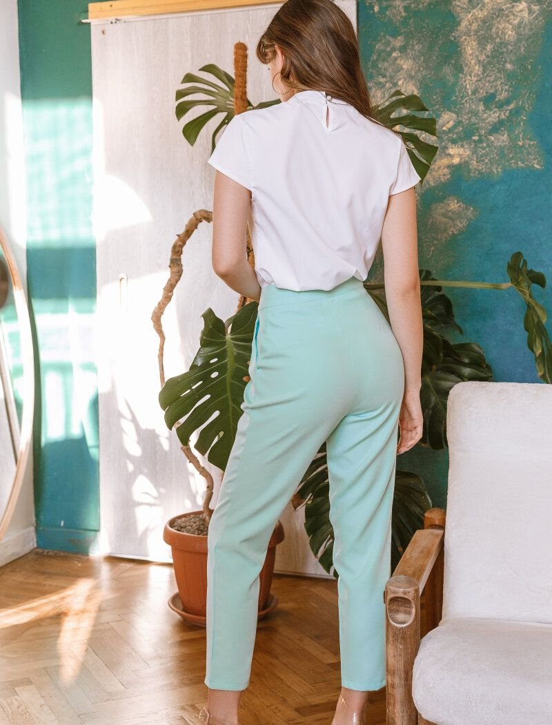 Laconic trousers of a mint shade. High waist, narrow cut, pinches and two welt pockets on the sides.