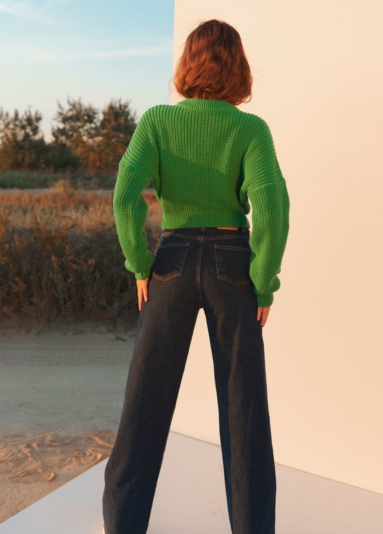 The Pantone Color Institute highlights green as one of the main colors of the year, and continues to be trending in the FW 2021/22 season. A short-cut jumper with long sleeves, a deflated shoulder line.