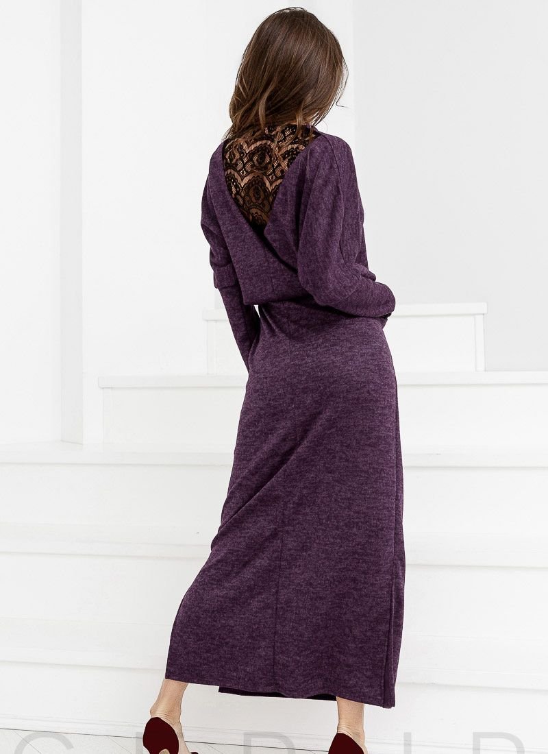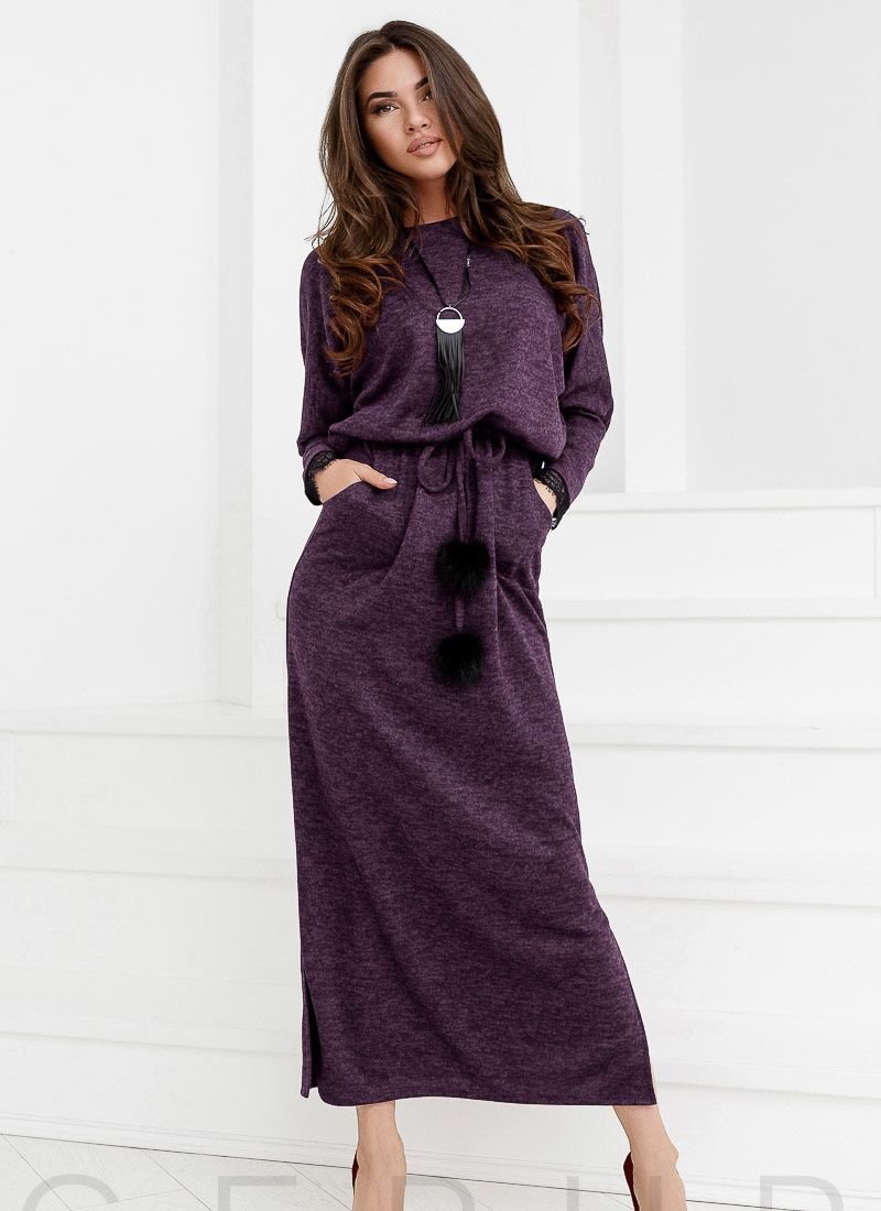 A versatile knitted dress with a long skirt, two welt pockets, a pull-in belt with drawstring ties, a lace insert on the back and a removable pendant.