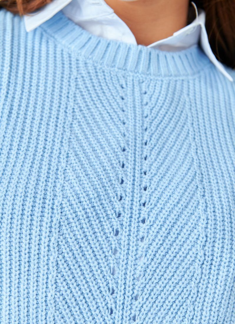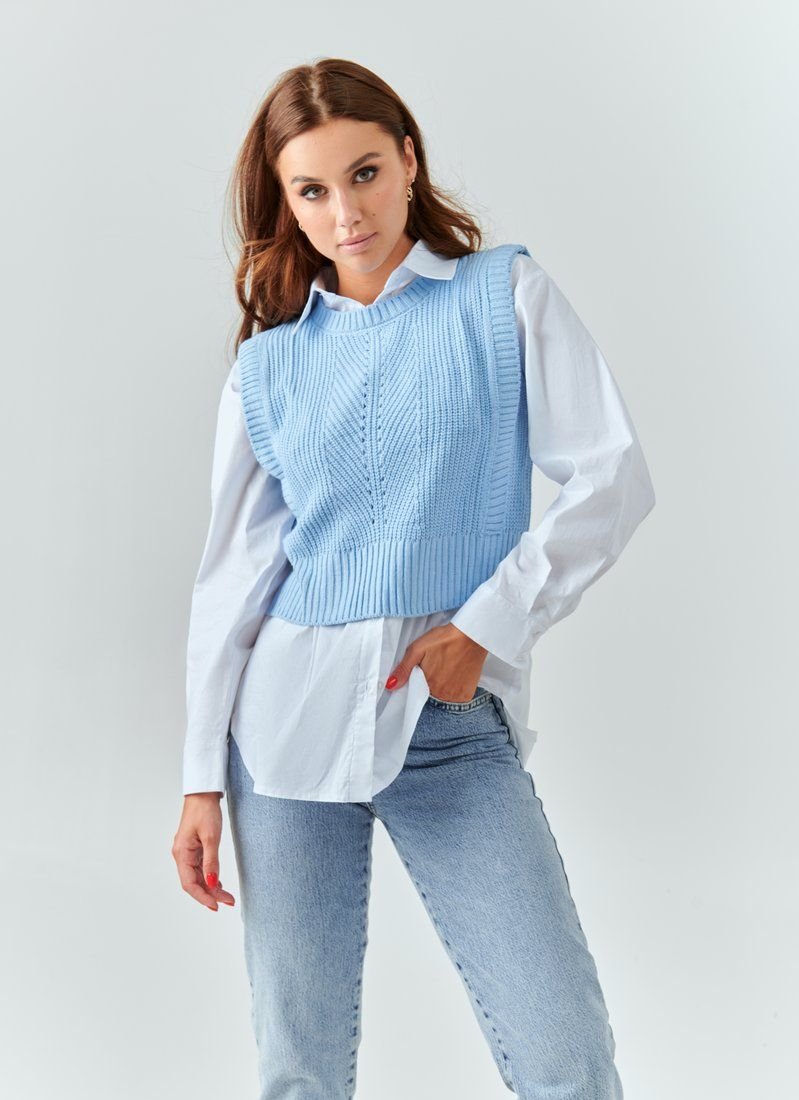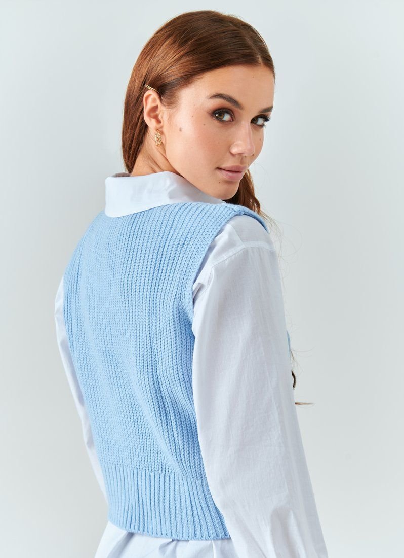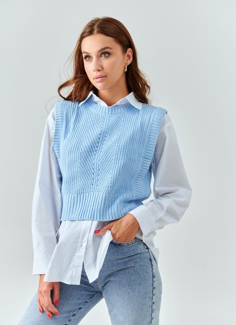 Knitted vest in a delicate blue shade. Such a thing in the wardrobe will help dilute the everyday image and make it more interesting. In particular, it will look stylish in combination with shirts.
