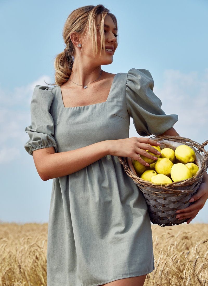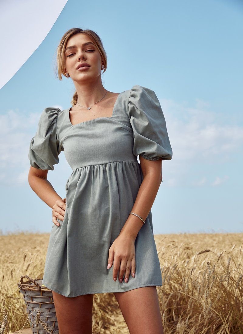 A short dress with an inflated waistline, made of soft linen fabric. The open back is complemented by elastic lacing. A spectacular puffy sleeve with an elastic cuff and a neat square neckline on the chest. the dress is perfect for everyday looks in the hot season.