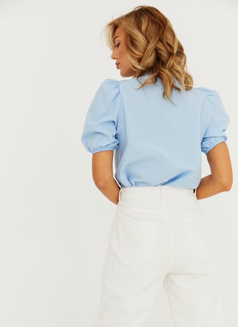 A loose blouse of a blue shade looks quite informal for the office due to the accent collar. The lace detail supports the current SS'21 trend. Soft cotton material was chosen for sewing the model with short lantern sleeves.
