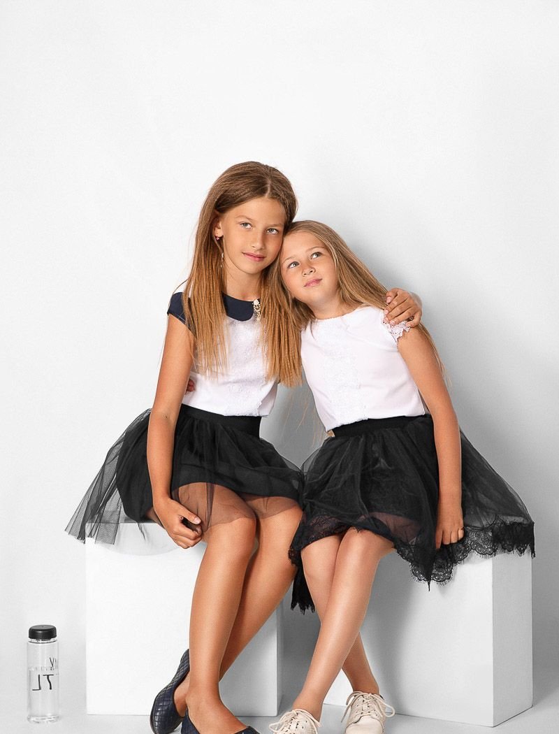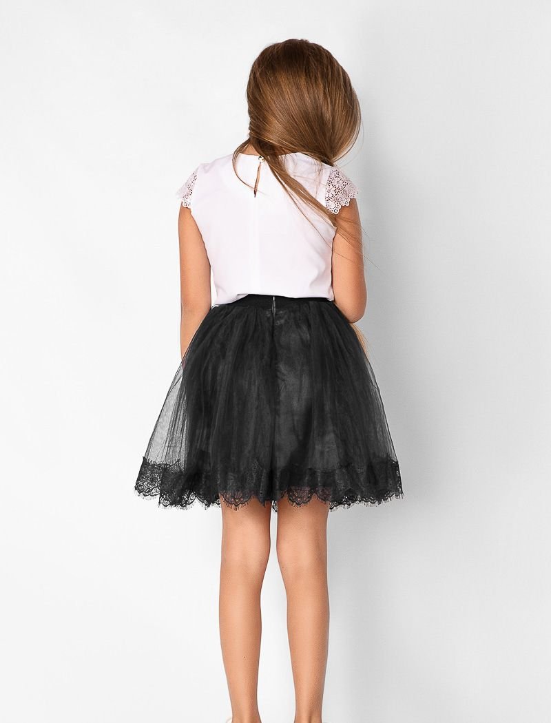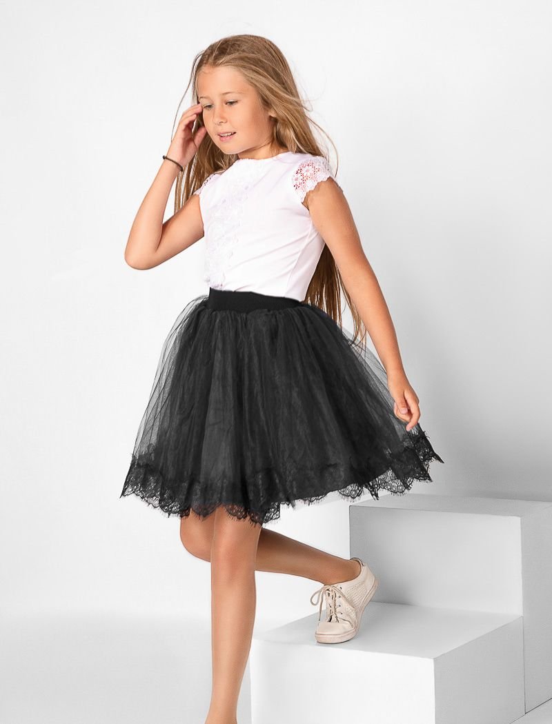 A fluffy children's skirt made of tulle with an elastic waistband and a lace trim at the hem.