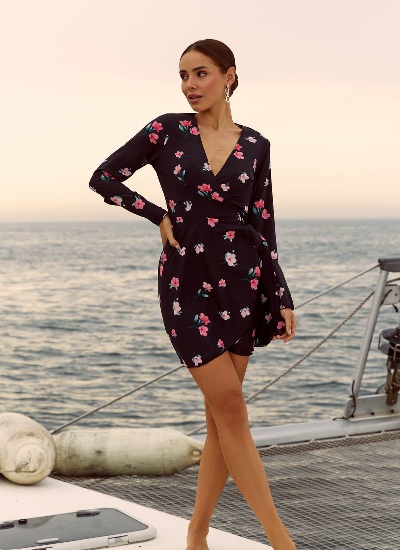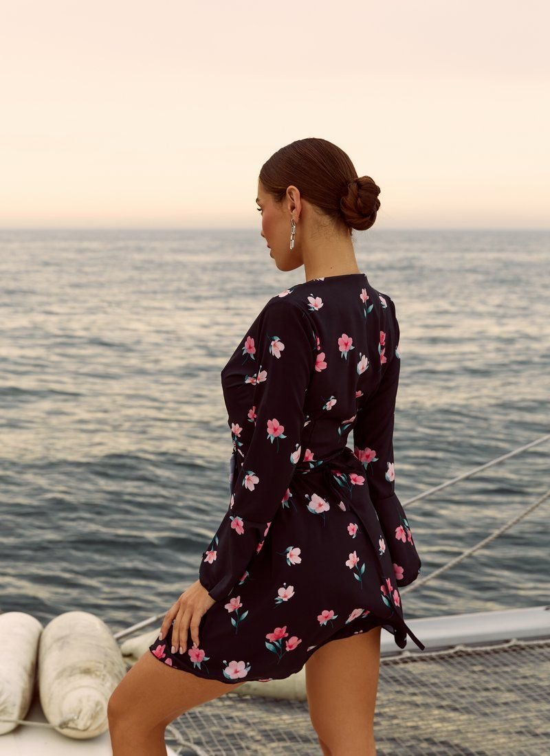 A light dress made of flowing fabric in a floral print. Long sleeve with a loose fit, decorated with a flounce. Deep v-neck on the chest and a short flared skirt.