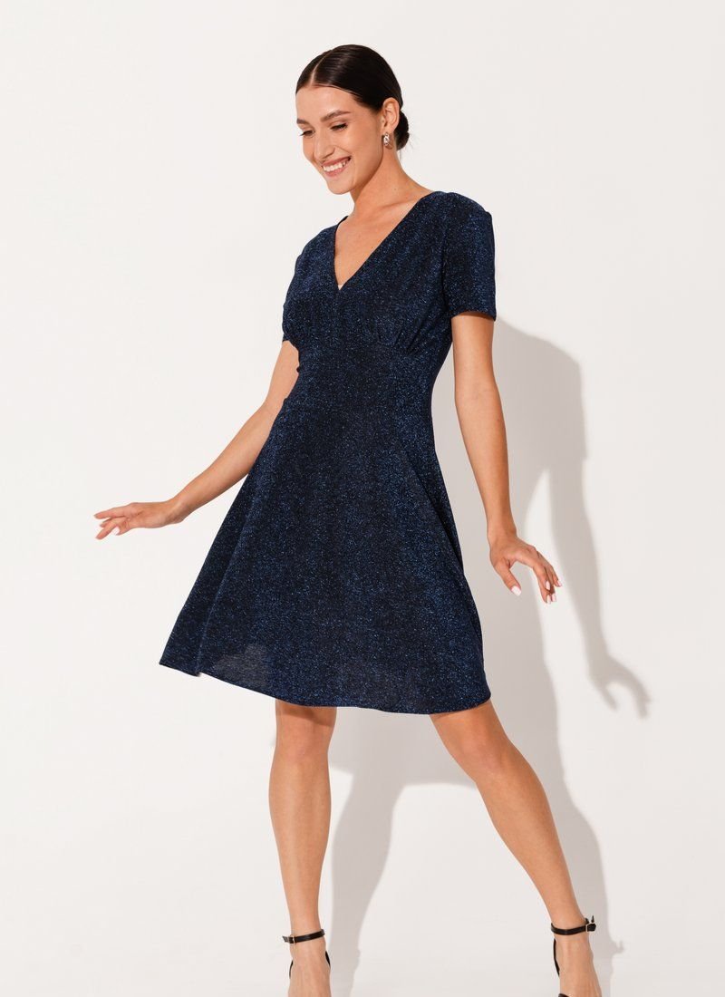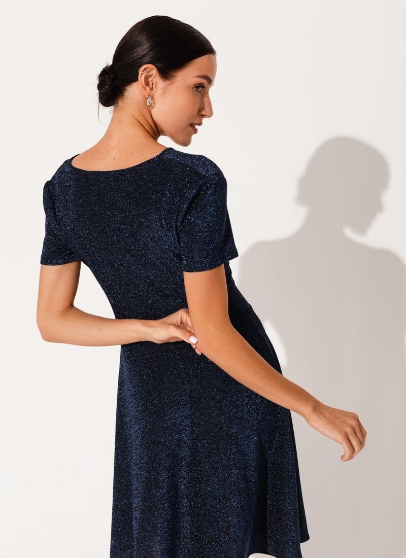 A small blue dress creates a wow effect, due to a fitted silhouette, a v-shaped deep neckline and a wide waistband. The shimmer created by the material with lurex also acts as a decor.