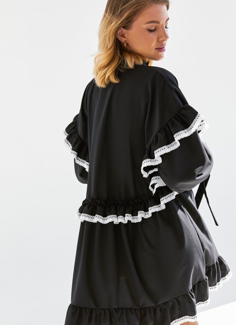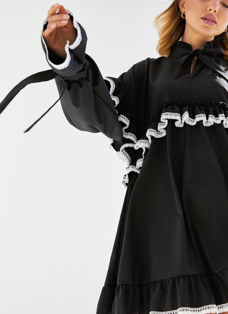 The black dress is made of a lightweight material that maintains an optimal body temperature. The relaxed silhouette was decorated with flounces with contrasting openwork lace. The ascot collar emphasizes the neck.