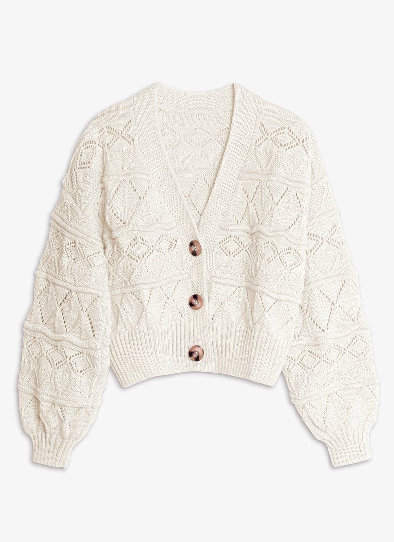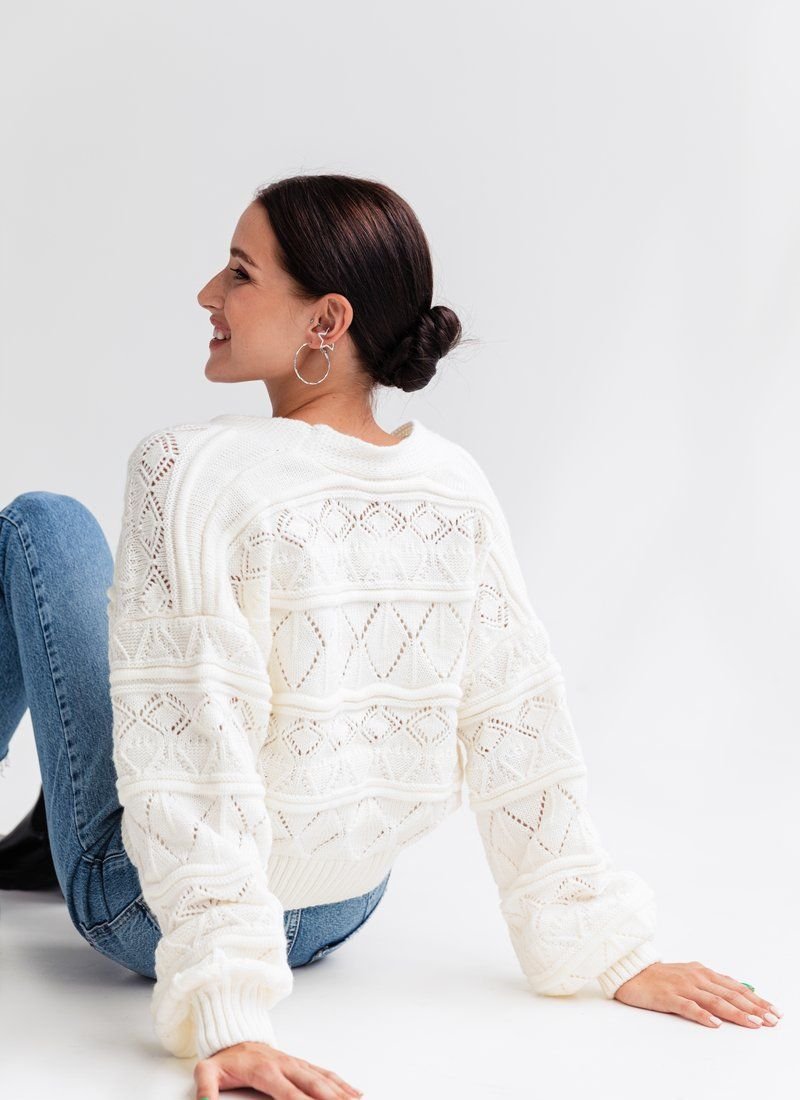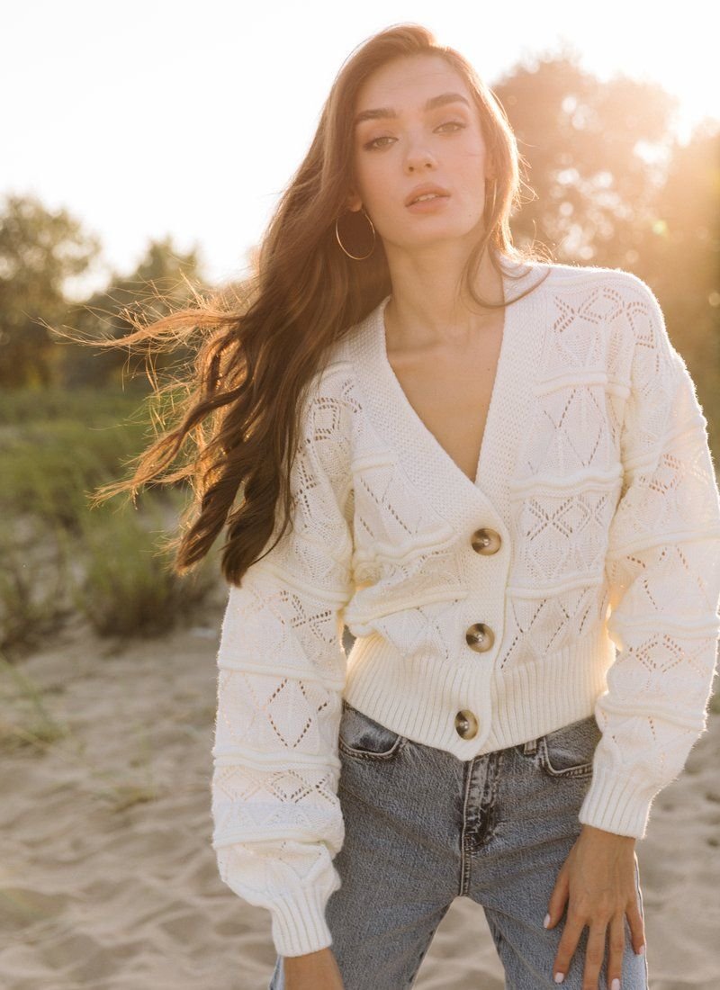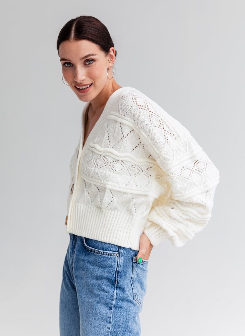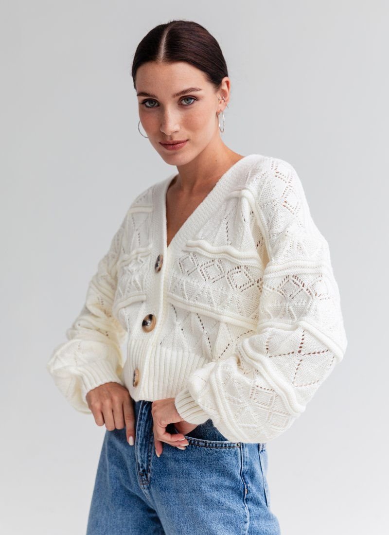 A cropped cardigan of a delicate milky shade will harmoniously complement the casual look with jeans. The model is made of textured knitted knitwear. The product with a loose cut is complemented by a v-neck, emphasizing the decollete area. The cardigan is fastened with large buttons.