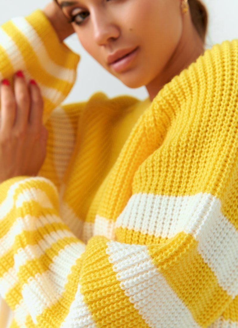 Oversize sweater of bright yellow color with a wide stripe. The product is made of a pleasant knitted knit and will keep you warm in the cool autumn and winter.