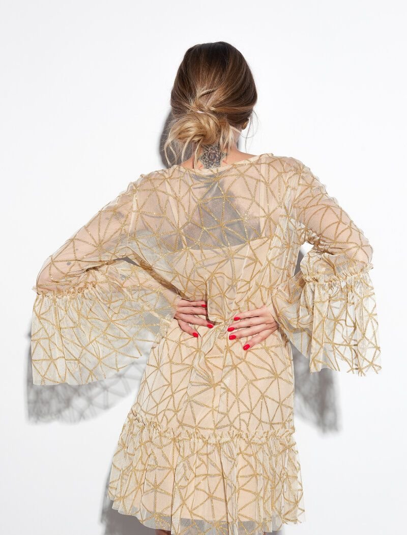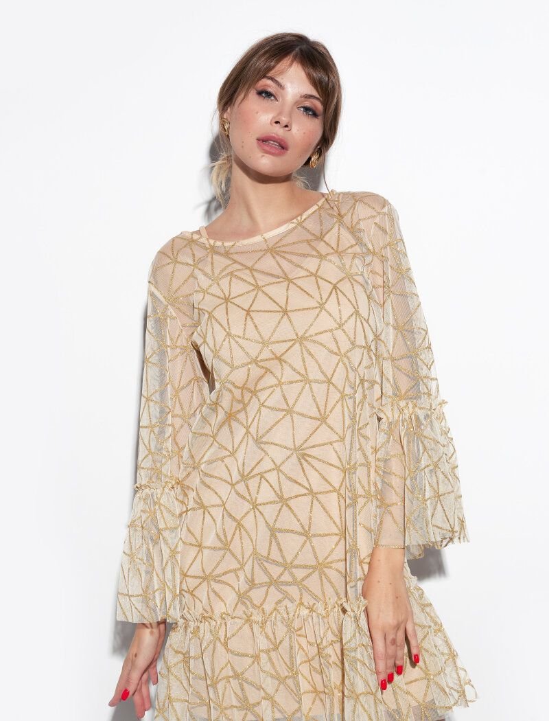 The model consists of two dresses: a combination dress with thin straps and an upper mesh dress with a decor. The neutral beige shade is compensated by a sparkling gold dusting. Romantic notes are given by flounces on the sleeves and the lower edge. The collection was presented by the popular Instagram blogger and It-girl-Yulianna Yussef.
