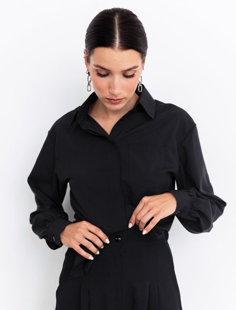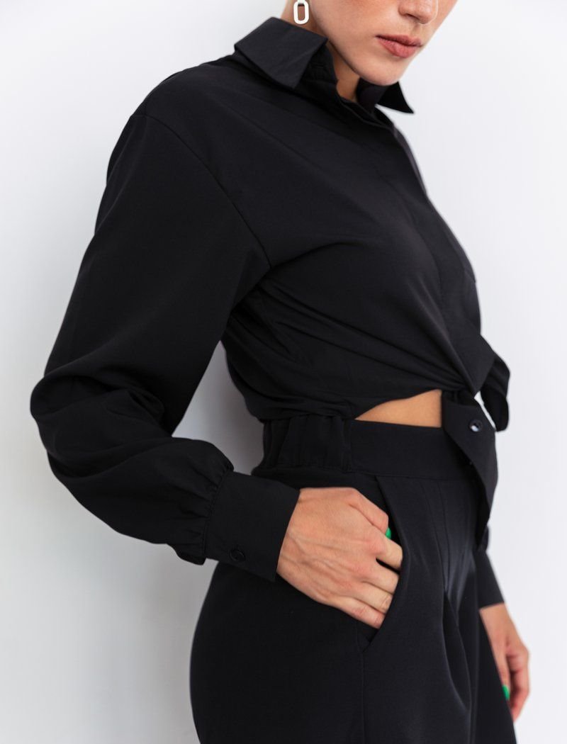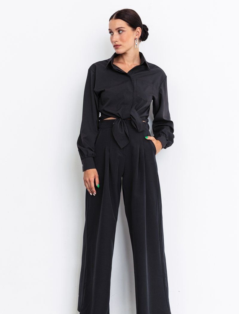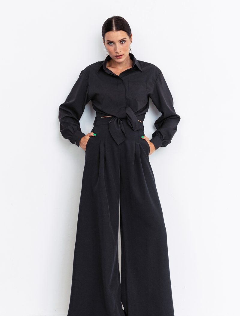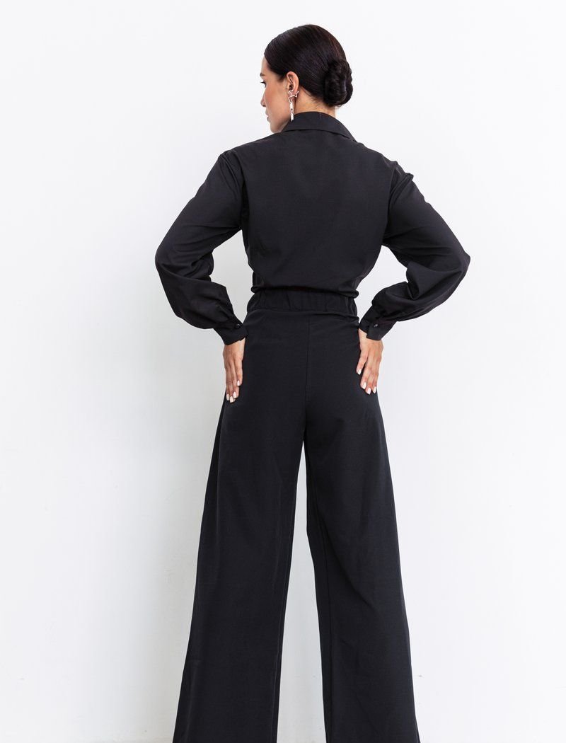 Black jumpsuit with wide trousers. The top of the product is in the form of a shirt with ties, there is a cut on the belt, which creates the effect of a suit. There is also an elastic insert in the belt for your comfort.
