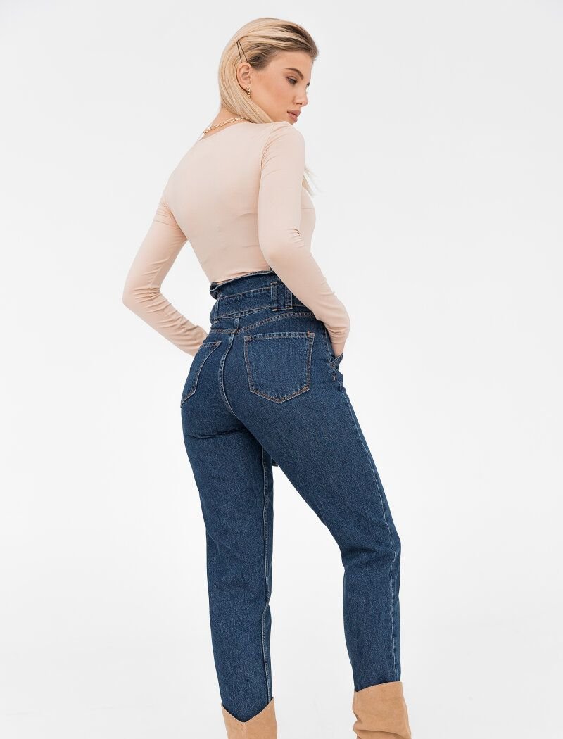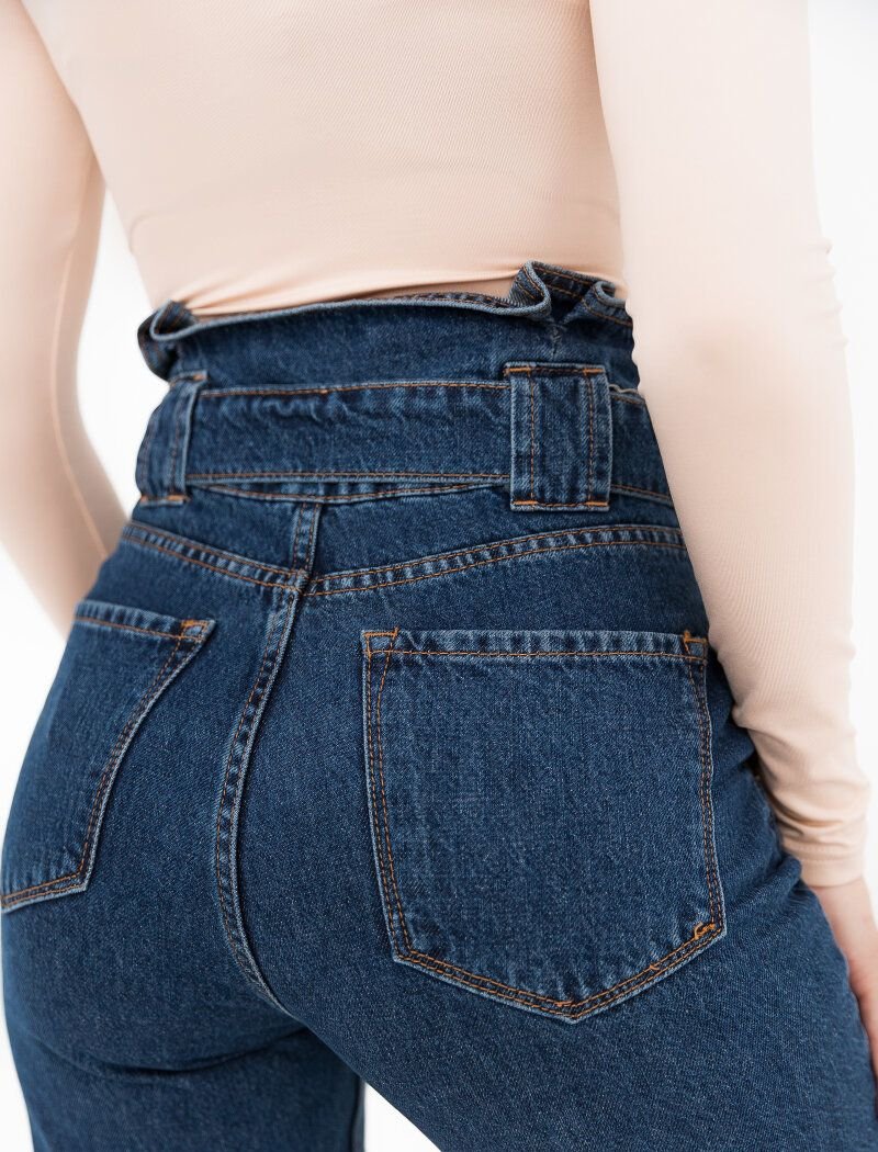 Blue cropped jeans will become the basis of the image in any style. The originality of the model is given by a wide belt, supplemented with pinches. Soft cotton is used for the production of the product. The set includes a removable belt made of the main material.